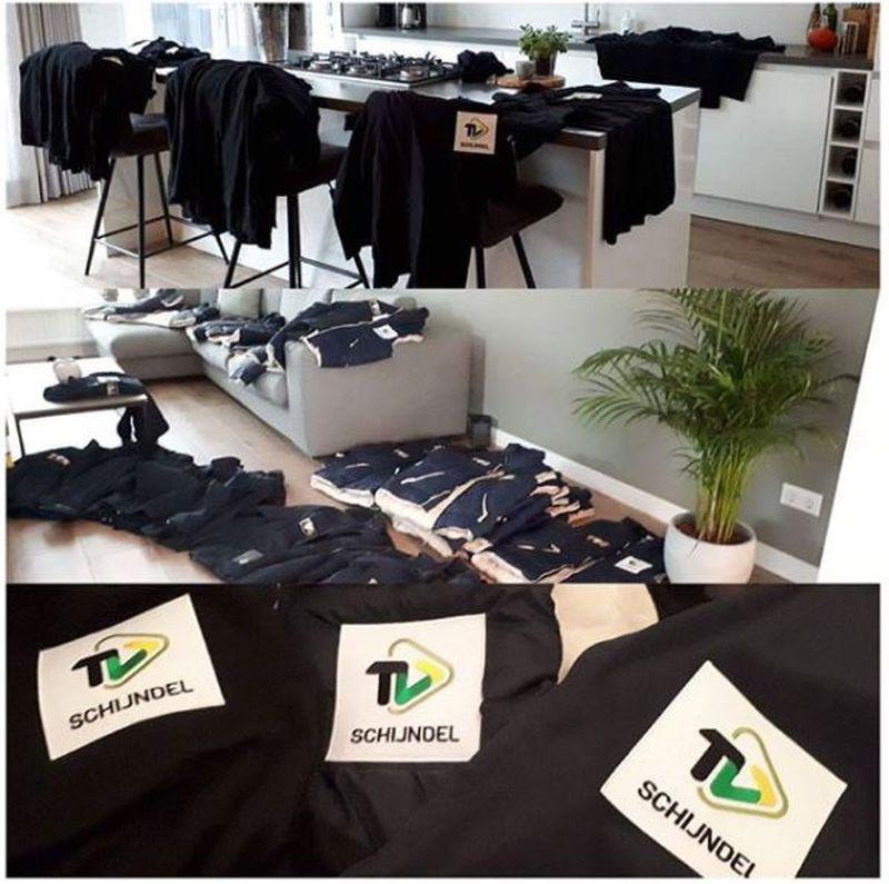 Schijndel - Een tijdje terug won Dirk Kremers de ontwerpwedstrijd voor de nieuwe huisstijl van TVSchijndel. Op alle (social media) kanalen van TVSchijndel zijn ons nieuwe logo en onze nieuwe kleuren inmiddels doorgevoerd. Maar TVSchijndel is ook bij evenementen en gebeurtenissen altijd herkenbaar met onze eigen kleding. Denk hierbij aan jassen, t-shirtjes en bodywarmers. Ook onze materialen zijn gekenmerkt met stickers. Om ons nieuwe logo toe te passen op al deze zaken werd de samenwerking gezocht met TVE Reclameproducties. TVE Reclameproducties heeft in de afgelopen periode razendsnel de nieuwe huisstijl van TVSchijndel gedrukt op alle kleding en zijn er nieuwe banners, spandoeken en stickers voor onze materialen gemaakt. Het bestuur ging op zaterdag 2 december op bezoek bij Hennie van Osch voor de officiële overdracht en om hem heel hartelijk te bedanken voor deze fijne samenwerking. Vanaf nu zijn onze vrijwilligers weer overal herkenbaar in de kleding mét nieuwe huisstijl.