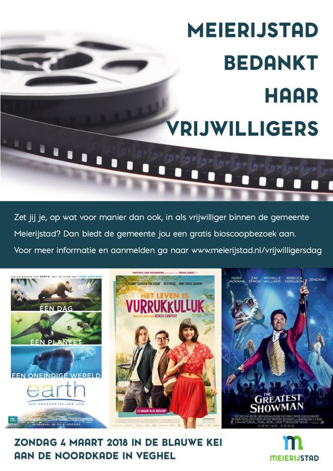 Derde filmfestival Gezien het succes van de afgelopen jaren bieden de gemeente alle vrijwilligers binnen Meierijstad dit jaar voor het derde jaar op een rij een gratis bioscoopbezoek aan tijdens het Filmfestival voor vrijwilligers. Door het gevarieerde programma hoopt de organisatie veel mensen een plezier te kunnen doen. Vrijwilligers kunnen zich gratis voor een film aanmelden. U geeft daarbij aan naar welke film u voorkeur naar toe gaat (voorkeurvolgorde). Vrijwilligers die wonen in de gemeente Meierijstad en zich inzetten, op wat voor manier dan ook, in als vrijwilliger binnen de gemeente Meierijstad (bijvoorbeeld bij een sportvereniging, in de zorg, bij evenementen of wat dan ook) zijn van harte welkom.