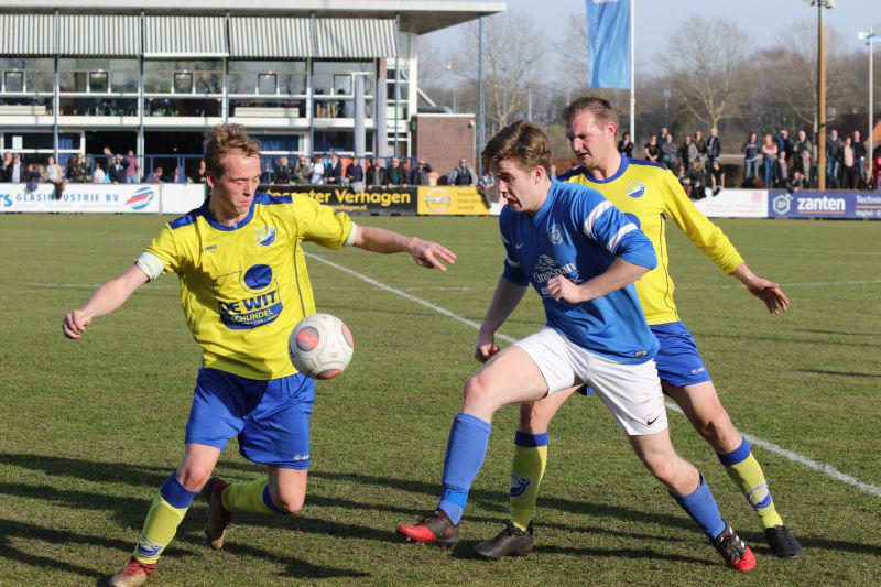 Schijndel - Dat het nog ‘billen knijpen’ zou worden in de tweede helft van de wedstrijd Schijndel/DE WIT – v.v. Handel, daar zag het in de eerste 45 minuten geheel niet naar uit. Schijndel/DE WIT kwam sterk uit de startblokken en wist vanaf de aftrap gevaar te stichten voor het doel van Tijmen Brouwer, de keeper van v.v. Handel. Al in de 11e minuut wist Schijndel/DE WIT te profiteren van een niet goed verwerkte corner van v.v. Handel. Jirre Kreemer wist de bal buiten het 16-meter gebied op te pikken en leverde met zijn linkerbeen een uitstekende pass af, waardoor Thomas-Jan van Raaij de 1-0 kon aantekenen. Nog geen kwartier later stichtte rechtsback Max Neppelenbroek met een machtige rush voor gevaar in de v.v. Handel gelederen. Zijn voorzet kwam bij Stan Guns die in eerste instantie zijn schot geblokkeerd zag, maar in de rebound toch wist te scoren: 2-0. Eindstand werd 2-1.