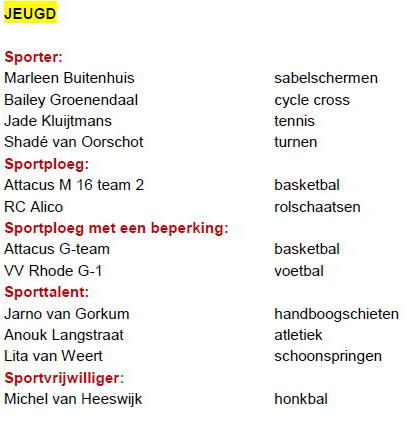 » Avond In de avond gaat het feest verder voor de volwassenen, met entertainment en huldigingen. Ook hier is Bas Muijs de presentator. De kampioenen (vanaf 18 jaar) worden gehuldigd, de Sport Awards worden uitgereikt en de winnaar van de publieksprijs wordt bekendgemaakt. De avond wordt geopend door burgemeester Van Rooij en wethouder Van der Pas reikt de prijzen uit.