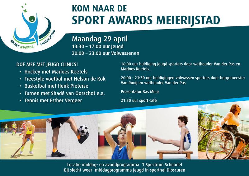 Meierijstad - Zoals eerder aangekondigd werden de genomineerden hiervoor niet op 1 maart maar op 1 april bekend gemaakt. Op maandag 29 april vindt de uitreiking van de Sport Awards Meierijstad plaats. De Sportraad Meierijstad en de gemeente organiseren dit sportfeest voor de verenigingen en vrijwilligers die het, dag in dag uit, mogelijk maken te sporten. Stemmen op genomineerden is nu van start gegaan. Het feestprogramma van de middag en avond vindt u hieronder die beide gehouden worden in Cultureel Centrum 't Spectrum in Schijndel. Bij slecht weer vindt het middagprogramma voor de jeugd plaats in sporthal Dioscuren. U kunt dus nu stemmen op uw favoriet. Noteer 29 april vast in uw agenda, u bent van harte welkom.