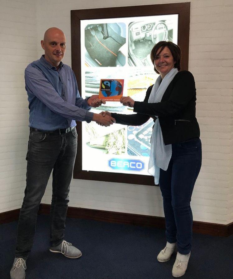 Berco Berco, het grote bedrijf dat in Schijndel automatten produceert is sinds 2018 al fairtrade. De bezoekers en medewerkers op kantoor drinken fairtrade koffie en thee. Behalve aandacht voor de boeren in ontwikkelingslanden heeft het bedrijf nog meer oog voor duurzaamheid. Alle verlichting in de grote bedrijfshallen zijn vervangen door led-verlichting. De dakconstructie wordt aangepast, zodat er zonnepanelen gelegd kunnen worden. Er wordt daarbij straks meer energie opgewekt dan voor eigen gebruik. Het overschot aan stroom wordt afgenomen door andere bedrijven op het bedrijventerrein Duin. Yvonne Schellekens, die de fairtrade inkoop verzorgt, ontvangt uit handen van Arthur Rijken het fairtradebordje.