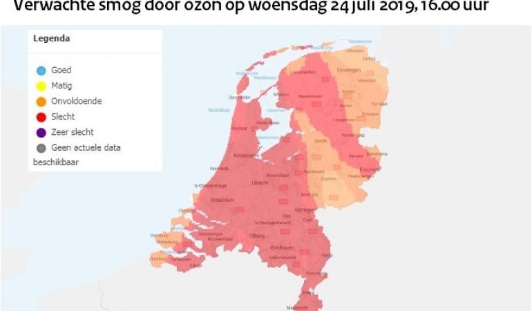 De Bilt / Wageningen - Bron KNMI Vanaf vandaag krijgt het hele land te maken met extreme hitte. Hiervoor is code oranje van kracht. In het Waddengebied geldt code geel. Vandaag liggen de maximumtemperaturen in een groot deel van het land tussen de 30 en 34°C. Morgen liggen de maxima tussen 32 en 38°C, donderdag tussen 33 en 39°C. Ook in de nachten koelt het maar moeizaam af, de minimumtemperaturen liggen rond de 20°C. Ook vrijdag volgt nog een tropische dag. Morgen is in heel Nederland kans op smog, zo meldt het RIVM. U leest er hieronder meer over. Kans op smog in heel Nederland Bron RIVM Morgen woensdag 24 juli 2019 is er in heel Nederland kans op smog door ozon. Naar verwachting wordt de luchtkwaliteit "slecht". Het RIVM Rijksinstituut voor Volksgezondheid en Milieu adviseert mensen die gevoelig zijn voor smog om binnen te blijven en om zware lichamelijke inspanning te beperken. Dit advies geldt voornamelijk in de namiddag en vroege avond, omdat de lucht dan het meest verontreinigd is. De aanhoudende tropische temperaturen en het inkomende zonlicht dragen bij aan de vorming van ozon. Op donderdag en vrijdag vindt dat proces in het hele land plaats.