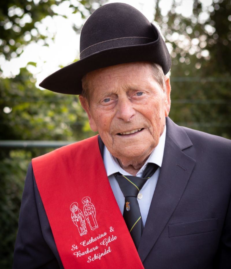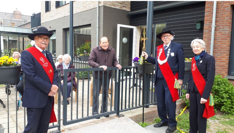 Schijndel - Gisteren bracht het Gilde Sint Catharina en Barbara uit Schijndel een bezoek aan St. Barbara. Ze kwamen in het bijzonder om hun ere-gildebroeder Wim Verkuijlen een vendelgroet te brengen, maar ook om de bewoners een hart onder de riem te steken. De bewoners genoten volop van hun aanwezigheid en met stralende gezichten klapten ze mee tijdens de vendelgroet met tromgeroffel, een mooie afleiding in deze moeilijke tijd. Wim Verkuijlen, de ere-gildebroeder, verblijft sinds vorig jaar in het verpleeghuis. Hij is al lid van het Schijndelse Gilde sinds de heroprichting en is altijd een trouw bezoeker geweest van gildeavonden en -activiteiten. Hij bekleedde een aantal jaren de functie van Deken-schrijver en schoot zich in 1984 tot Koning. Tijdens zijn 40-jarig jubileum ontving hij een onderscheiding van Kring Maasland. (foto: v.l.n.r.: Leo Telgenkamp, Wim Verkuijlen, Ad en echtgenote Inge Kools)