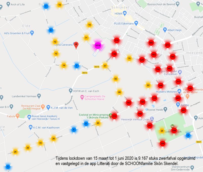 Schijndel - Na een lockdown van meer dan twee maanden gaan vandaag 2 juni ook de middelbare scholen weer van start en zal er wat de normale gang van zaken was vóór de lockdown weer meer terugkeren. In de periode van 15 maart tot 1 juni heeft de SCHOONfamilie Skôn Skendel met man en macht gewerkt om het zuidwesten van Schijndel op diverse momenten van zwerfafval te ontdoen. In het Kloosterpark en bij de sportveldjes tegenover de Heikantschool, de openbare paden van het Zuideinderpark en toegangswegen vanuit het zuidwesten naar het dorp zijn achtergelaten blikjes, flesjes, snoepwikkels, zakdoekjes, wetwipes en ander zwerfafval opgeruimd. Daarvan is 9.167 stuks geregistreerd in de app Litterati. Daarbovenop loopt een medewerker van de WSD meerdere dagen per week door het dorp, waaronder het centrum, het Kloosterpark en de sportvelden om zwerfafval op te ruimen.