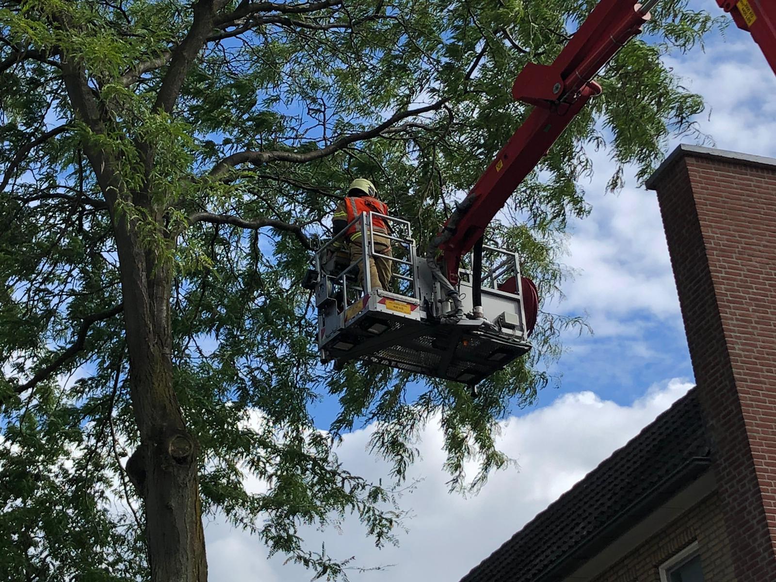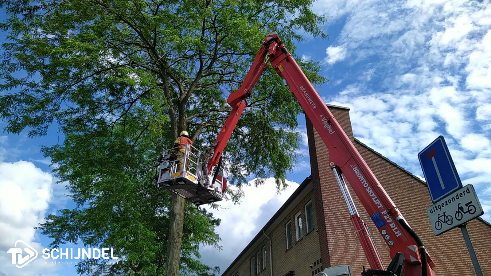 Schijndel - De brandweer van Veghel werd maandagavond opgeroepen naar de Deken Baekersstraat. Daar bleek een tak gevaarlijk los te hangen aan een boom boven het voetpad. Een vrouw had de tak los zien hangen en was naar de brandweerkazerne gelopen met de vraag wat er mee moest gebeuren. Een brandweerman was toevallig aan het werk (normaal is de post onbemand) en liep mee. Omdat een normale brandweerwagen oproepen geen zin had is de hoogwerker van Veghel opgeroepen. Deze was snel ter plaatse en de brandweerlieden hadden de tak ook snel los. Na ongeveer twintig minuten was de situatie weer veilig. Foto's: Christian vd Broek