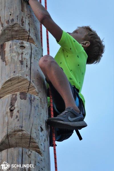 Wijbosch- De organisatie heeft een tijdje een slag om de arm moeten houden, maar uiteindelijk is het toch gelukt om met passende coronamaatregelen het WK paalklimmen door te laten gaan. Met veel vrijwilligers op de been om de entree, bar, EHBO en andere posten te bemannen, en om erop toen te zien dat er voldoende afstand onder de bezoekers werd gehouden. Maximaal 250 toeschouwers op het terrein en handen desinfecteren bij binnenkomst en bij de bar. Van bezoekers werd gevraagd om met maximaal 4 personen bij een tafeltje te staan. Waar eerst de lijst van deelnemers tussen 8 en 15 jaar nog vrij kort was, meldden nieuwe deelnemers zich zodra de eerste klimmers de top bereikt hadden. In het fotoboek vindt u alle foto's. Kyra mocht samen met Mirk het spits afbijten. Voor de 12-jarige Kyra de tweede keer dat ze meedeed. ‘Het blijft spannend ook al heb ik dit vorig jaar ook al gedaan.’ Nadat de eerste klimmers in de ruim 13 meter hoge paal de bel hadden geluid, meldde de 14-jarige Bas zich bij de organisatie voor een inschrijfformulier. ‘Ik wilde eerst niet, want het ziet er best moeilijk uit en je wilt niet voor schut staan. Maar ik heb me toch over laten halen.’ Bas kreeg dan ook assistentie bij het inschrijven om erop toe te zien dat hij zich niet meer bedacht. Andere kinderen benoemden dat het er ook wel eng uit zag. ‘De kinderen zitten gezekerd en hebben een klimtuig aan, dus de klim is veilig,’ vertelde de organisatie. De klimtijden varieerden van 19 seconden tot bijna 3 minuten en er waren daarbij ook verschillende tactieken te zien. De een deed bijna alles op spierkracht van de armen, de ander liet de benen het werk doen. De pauzes van de wedstrijd paalklimmen werden door optredens van verschillende bands ingevuld. Van de meiden was Eline Klein met een tijd van 19.93 seconden de snelste. Op de tweede plaats Eva Donkers met 20.72 seconden en op de derde plaats Sanne van de Wijdeven met 20.94 seconden. Bij de jongens won Björn Groenendaal met 25.78 seconden. Op de tweede plaats eindigde Michon Scheutjens met 30.28 seconden en op de derde plaats Jordy v.d. Heuvel met 33.15 seconden.