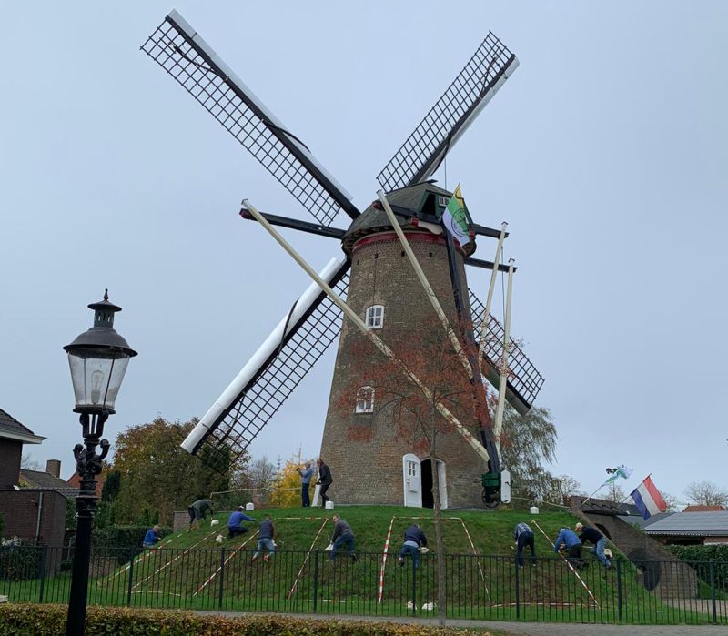 Schijndel - Ter afsluiting van het 175-jarig jubileum van korenmolen De Pegstukken werden gisteren bloembollen geplant door de voorbereidingsgroep op het talud van de berg bij de molen. Vanwege de gevolgen van de Coronacrisis konden de activiteiten voor het jubileum van de molen geen doorgang vinden. Zeer jammer maar de gezondheid van iedereen gaat uiteraard voor. Ter afsluiting van dit feitelijke jubileumjaar werden er bloembollen geplant zodat de molen in het voorjaar van 2021 met een frisse bloemenzee een hopelijk coronavrij 2021 in kan gaan en het geheel weer een feestelijk tintje krijgt. De bloembollen zullen dan in volle bloei te bewonderen zijn. Geen jubileum in september 2020 wil niet zeggen dat er nooit een jubileumviering zal zijn. De voorbereidingsgroep blijft bestaan, blijft plannen maken en gaat er vanuit dat ze in het 2de weekeinde van september 2021 alsnog het 175-jarige jubileum voor en met de gehele gemeenschap, middels een weekend vol sfeervolle activiteiten kunnen organiseren.