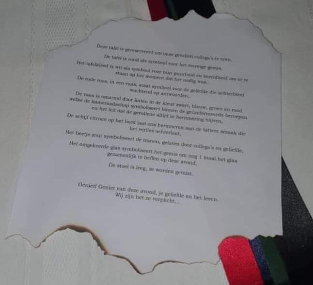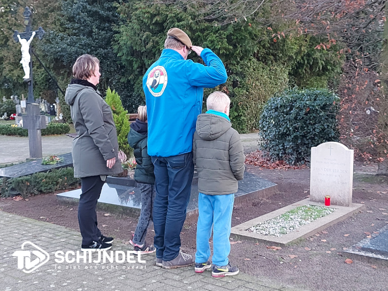 Schijndel - Veteraan Twan Vermeer en zijn gezin hebben deze kerstavond de omgekomen Schijndelse oorlogsslachtoffers geëerd en herdacht. Twan, zijn vrouw en hun twee kinderen ontstaken bij de oorlogsgraven in Schijndel een kaars en plaatsten die bij de grafstenen. Vervolgens bracht veteraan Twan een eregroet. Twan: "Ik vind het belangrijk om te herdenken. Ik herdenk niet alleen de slachtoffers van vroeger maar ook van de huidige missies. En één persoon in het bijzonder. Ik vind het een eer om dit te kunnen doen en het maakt mij emotioneel. Ook vind ik het belangrijk om het mijn kinderen mee te geven. Deze mensen mogen nooit vergeten worden. Lest we forget." In heel Nederland worden op Kerstavond de helden herdacht die hun leven gaven voor ons land. De oorsprong van dit initiatiefligt in Holten, waar 25 jaar geleden de Canadese begraafplaats al werd verlicht door de vele kaarsen. In het fotoboek een beeldverslag van de indrukwekkende herdenking. (Het artikel gaat verder onder 'lees meer')In 2015 werd er een oproep gedaan op Facebook om meer begraafplaatsen te voorzien van kaarsen. Dat jaar werden 140 graven verlicht, in 2019 lichtten ruim 445 graven op en sinds dit jaar dus ook in Schijndel. Er zijn ook andere initiatieven om de oorlogsslachtoffers te herdenken, zo plaatst het Veteranen Search Team een ronde tafel gedekt voor één persoon. Op deze tafel ligt dan ook altijd een brief met de uitleg (zie foto's). Er liggen in Schijndel zestien oorlogsslachtoffers begraven: één persoon op Hoevenbraak, één persoon op de begraafplaats in het centrum en veertien slachtoffers zijn begraven in een groot graf bij de kerk op de Boschweg. (Foto's tafel en uitleg: Dennis van Kraats)