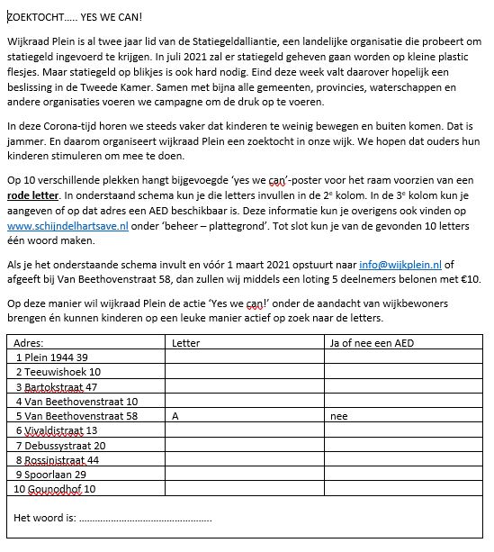 Schijndel - Wijkraad Plein is al twee jaar lid van de Statiegeldalliantie, een landelijke organisatie die probeert om statiegeld ingevoerd te krijgen. In juli 2021 zal er statiegeld geheven gaan worden op kleine plastic flesjes. Maar statiegeld op blikjes is ook hard nodig. Eind deze week valt daarover hopelijk een beslissing in de Tweede Kamer. Samen met bijna alle gemeenten, provincies, waterschappen en andere organisaties wordt er campagne gevoerd om de druk op te voeren. In deze Corona-tijd komt het steeds vaker voor dat kinderen te weinig bewegen en buiten komen. Dat is jammer. En daarom organiseert wijkraad Plein een zoektocht in de wijk en hoopt dat ouders hun kinderen stimuleren om mee te doen. Op tien verschillende plekken hangt bijgevoegde ‘yes we can’-poster voor het raam voorzien van een rode letter. In onderstaand schema kun je die letters invullen in de tweede kolom. In de derde kolom kun je aangeven of op dat adres een AED beschikbaar is. Deze informatie kun je ook vinden op www.schijndelhartsave.nlonder ‘beheer – plattegrond’. Tot slot kun je van de gevonden tien letters één woord maken.