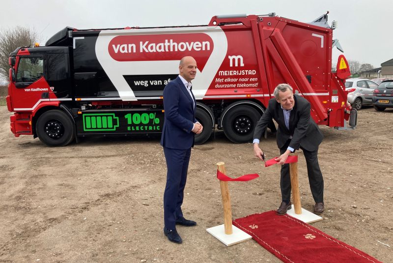 Meierijstad - Vanaf vandaag rijdt er een 100% elektrisch aangedreven truck van Van Kaathoven door de straten van gemeente Meierijstad. De wagen wordt exclusief voor Meierijstad ingezet op de routes voor inzameling van PMD-afval en is voorzien van een kraakpers. Elektrisch rijden betekent minder fijnstof, minder CO2 uitstoot en minder geluid. Het is het resultaat van de aanbesteding waarbij de duurzaamheidsambities van de gemeente een belangrijke factor waren. Op de foto staan wethouder Harry van Rooijen en Rob Meulendijks, Directie Van Kaathoven.