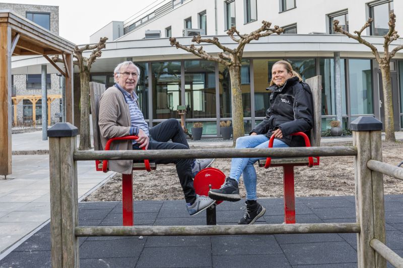 Schijndel - De gemeenschappelijke tuin van het Mgr. Bekkershuis (onderdeel van zorgorganisatie Laverhof) en de tegenoverliggende seniorenwoningen (woningbouwvereniging Woonmeij) is vernieuwd. De huidige binnentuin bracht niet veel voor de bewoners en werd niet optimaal gebruikt. Door de verbouwing van het Mgr. Bekkershuis, groeide de behoefte om ook de tuin grondig aan te pakken. Laverhof en Woonmeij sloegen de handen ineen en hebben samen met idverde NL één nieuwe buitenruimte gerealiseerd waar bewoners van beide complexen elkaar kunnen ontmoeten, kunnen bewegen en ontspannen. Op de foto ziet u een bewoner van Laverhof, de heer Van de Wijdeven samen met Agnes de Veth, coördinator team Wijkbeheer bij Woonmeij. foto is gemaakt door Hetty Hairwassers