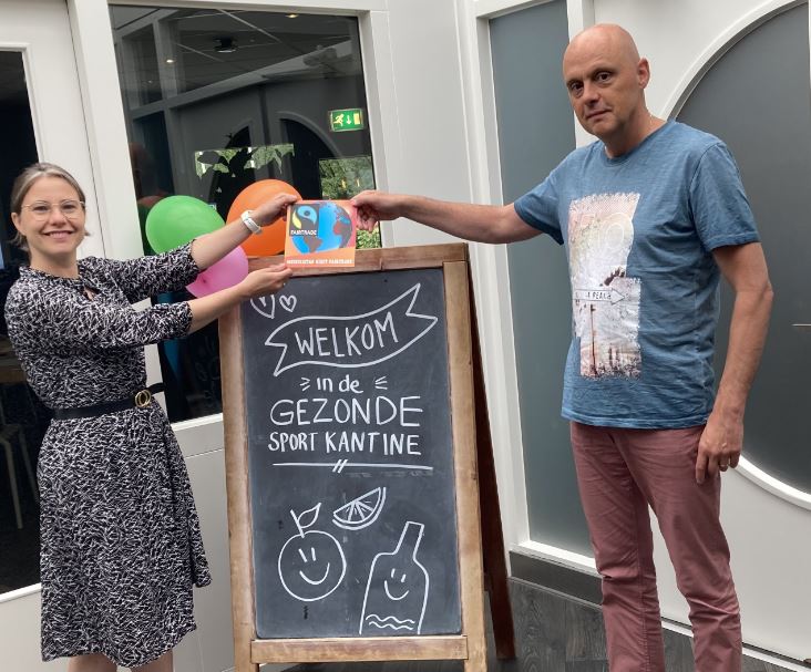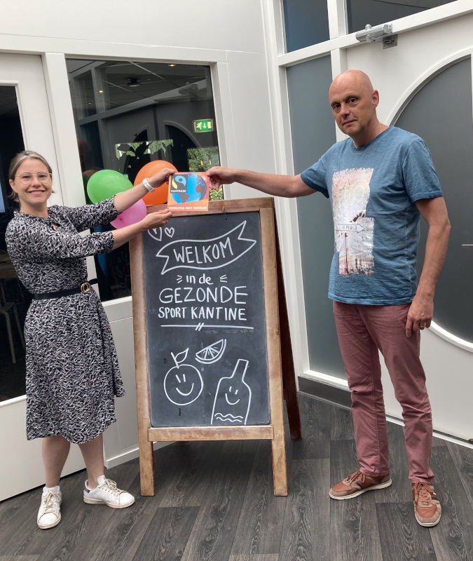 Schijndel - De horeca van zwembad De Molen Hey is vorig jaar augustus officieel al geopend, maar daarna door corona veel gesloten geweest. Sinds kort is de kantine weer regelmatig open en kan men na het zwemmen terecht voor een eerlijk bakje koffie of thee. De medewerkers hebben tijdens de eerste opening een gouden certificaat ontvangen omdat ze een gezondere kantine zijn. Ze werken volgens de Richtlijnen Gezondere Kantines die zijn opgesteld door het Voedingscentrum. “Natuurlijk verkopen we ook een frietje, maar we maken de gezonde keuze de makkelijke keuze”, aldus Janneke Sarijoen – Van Maasakker. Janneke is 1 van de collega’s die zowel achter de balie werkt als in de kantine. Deze combinatiefunctie is heel goed te doen en de medewerkers maken er een sport van om mensen gezonder te laten leven. Daar komt nu nog een extra erkenning bij: de kantine heeft het bordje 'Fairtrade' ontvangen.