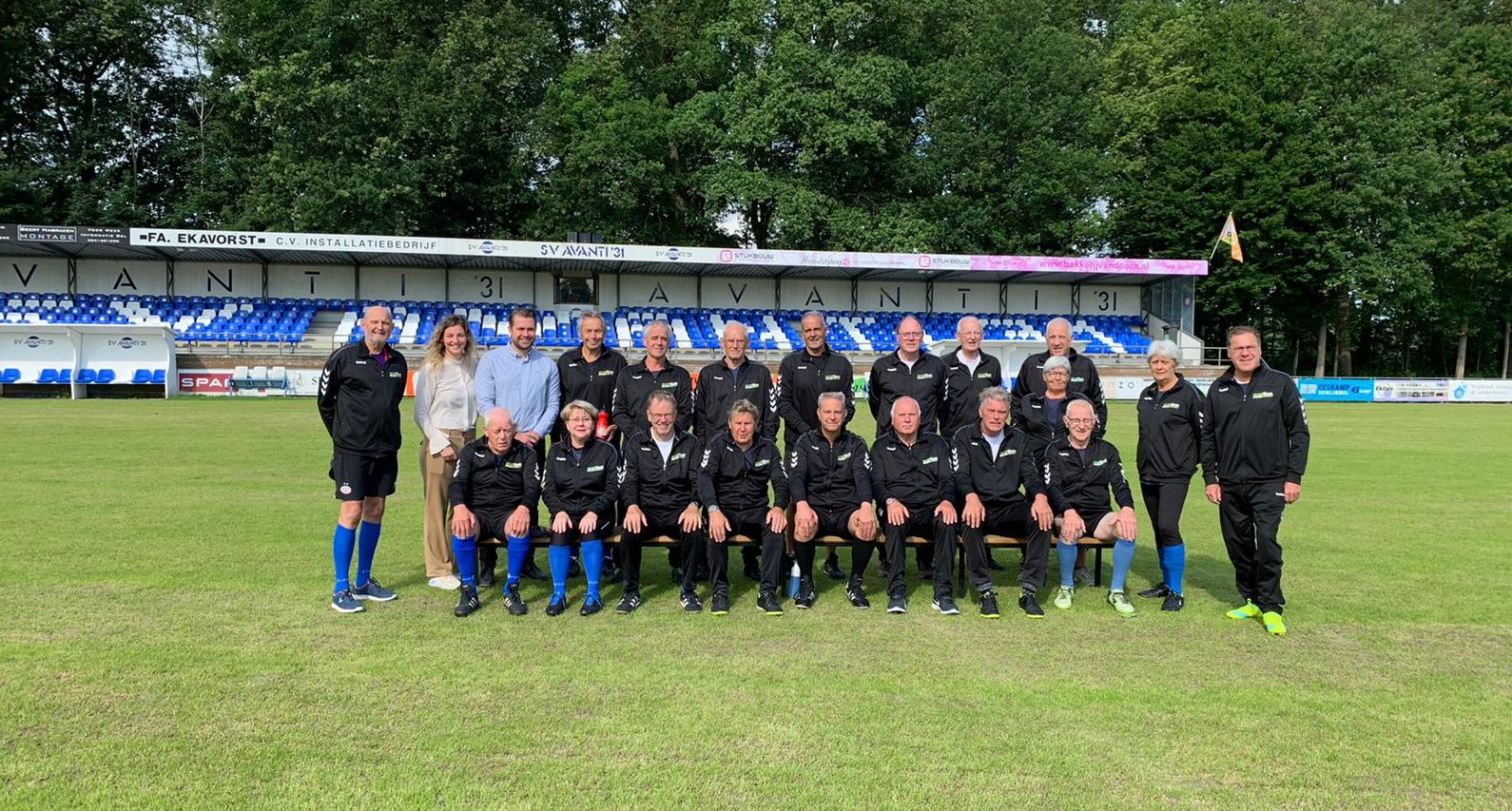 Schijndel - Begin dit jaar kwamen er nieuwe eigenaren in in PLUS Eikemans en werd het PLUS BERTRAMS. Joey Bertrams en Lysanne van Reijen namen het zakelijke roer over. Zij waren toen direct bereid om de sponsoring van dit OldStars team over te nemen. Afgelopen donderdagochtend kwamen beide nieuwe eigenaren naar het Avanti terrein om een nieuwe teamfoto te maken. Na de foto zagen Lysanne en Joey vol bewondering en respect hoe er, volgens concept, onder leiding van Mink Versluis op het uitgezette oefen- en speltraject bewogen en getraind werd. Ze zagen ook dat dit een perfect bewegingsconcept voor senioren is. In Meierijstad wordt dit concept zowel bij OldStars voetbal, OldStars Hockey, OldStars korfbal en OldStars handbal (in de zaal) beoefend. In Veghel zijn het walkingsporters die daar actief zijn.