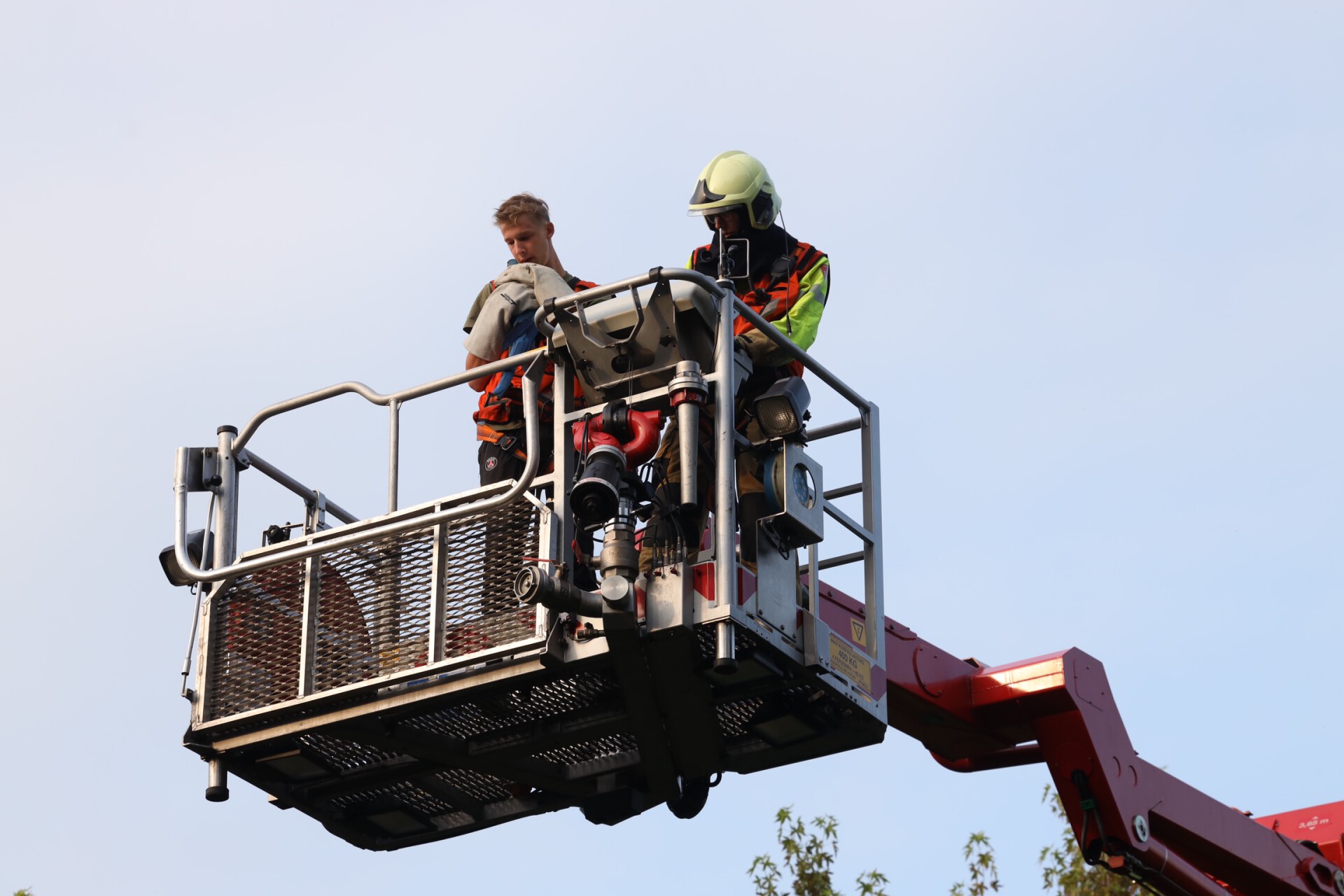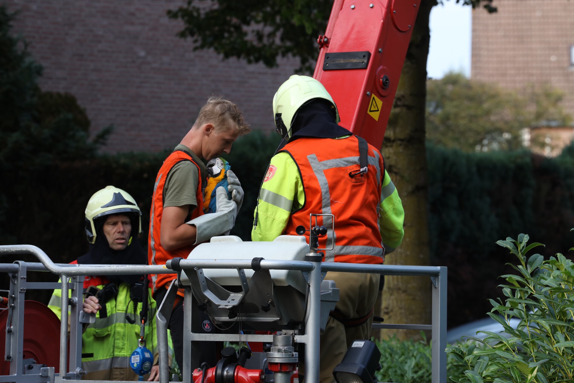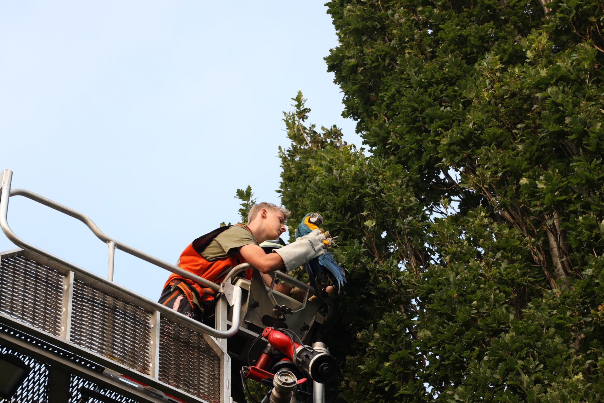Schijndel - Rond 17.30 uur werd de brandweer gebeld i.v.m. een ara welke hoog in een boom zat nabij de Mozartstraat in Schijndel. Het beest zat al vanaf 14.00 uur in de boom maar verplaatste zich helemaal niet meer. Hij zat zo hoog dat het baasje er niet eens bij kon. Uiteindelijk kwam de brandweer met een hoogwerker ter plaatse. Onder toeziend oog van vele buurtbewoners heeft het baasje vanuit de hoogwerker de vogel weten te bevrijden, deze zat vast met zijn poot in de boom. Eenmaal terug op de grond werd de vogel weer veilig in zijn kooi opgeborgen en de brandweer vriendelijk bedankt. Foto's en info: Persburo Sander van Gils![]() |