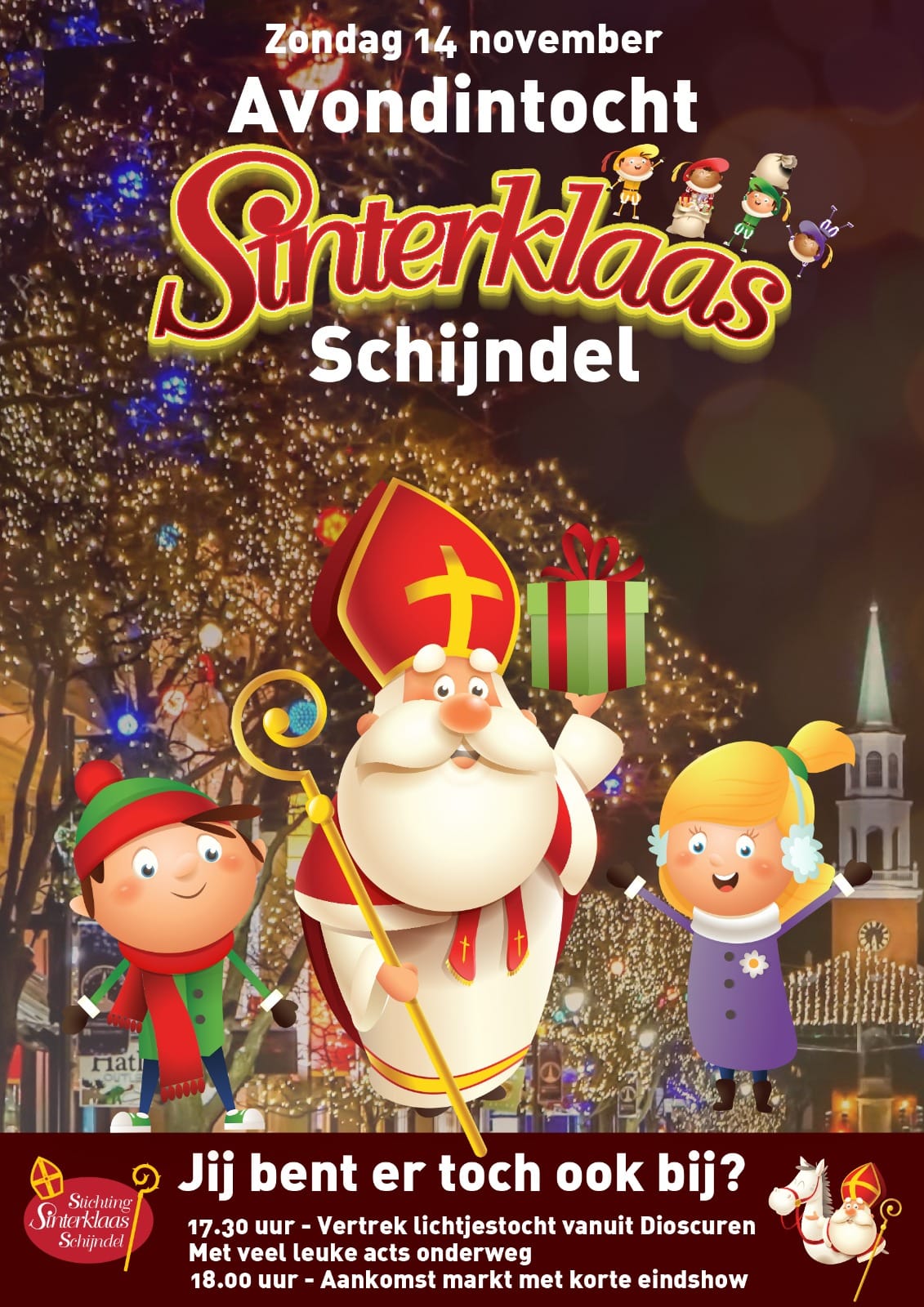 Op zondag 14 november om 17.30u zal het startschot gegeven worden voor de lichtjestocht door het sfeervol verlichte centrum van Schijndel. De tocht eindigt op de markt alwaar een mooie eindshow de kinderen verder in Sinterklaassferen brengt.