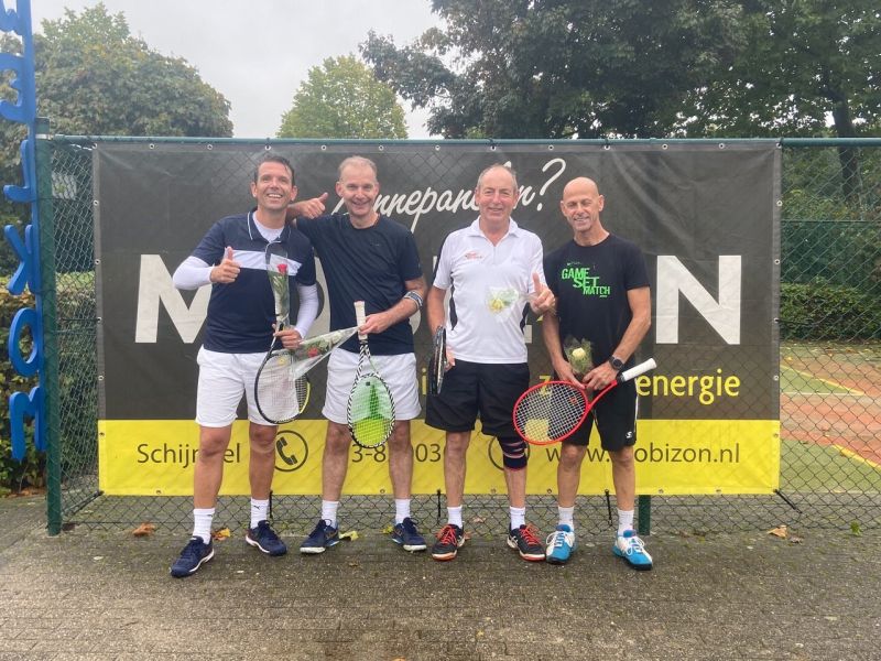 Schijndel - Afgelopen week stond bij tennisvereniging De Hopbel in het teken van de jaarlijkse clubkampioenschappen. Door corona werd het toernooi verschoven van het voorjaar naar het najaar. Hierdoor moesten deelnemers dit keer regen en onweer trotseren. Toch was het een gezellig en sportief toernooi met herfstig maar een spannende afsluiting. De clubkampioenen werden zondag 3 oktober gehuldigd. TV De Hopbel bedankt alle spelers voor hun deelname en volgend jaar weer gewoon in het voorjaar. Foto vlnr: DH5 Koen Korsten, Rob van Acquoy, Bert van Geffen en Johnny Havinga.