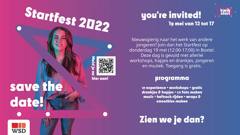 Startfest op 19 mei “Op 19 mei organiseren we ons Startfest. Dit festival is er voor alle inwoners tussen de 15 en 29 jaar van de gemeenten waarvoor wij werken”, vertelt Kim Hagens, trajectconsulent jongeren bij WSD Kwikstart. “Lukt het je niet om zelf een baan te vinden? Kom dan naar WSD in Boxtel, Schouwrooij 20. Van 12 tot 17 uur hebben we hier allerlei workshops, enthousiaste jongeren, hapjes en drankjes en muziek. We laten je kennismaken met WSD Kwikstart en alle mogelijkheden voor jou.”