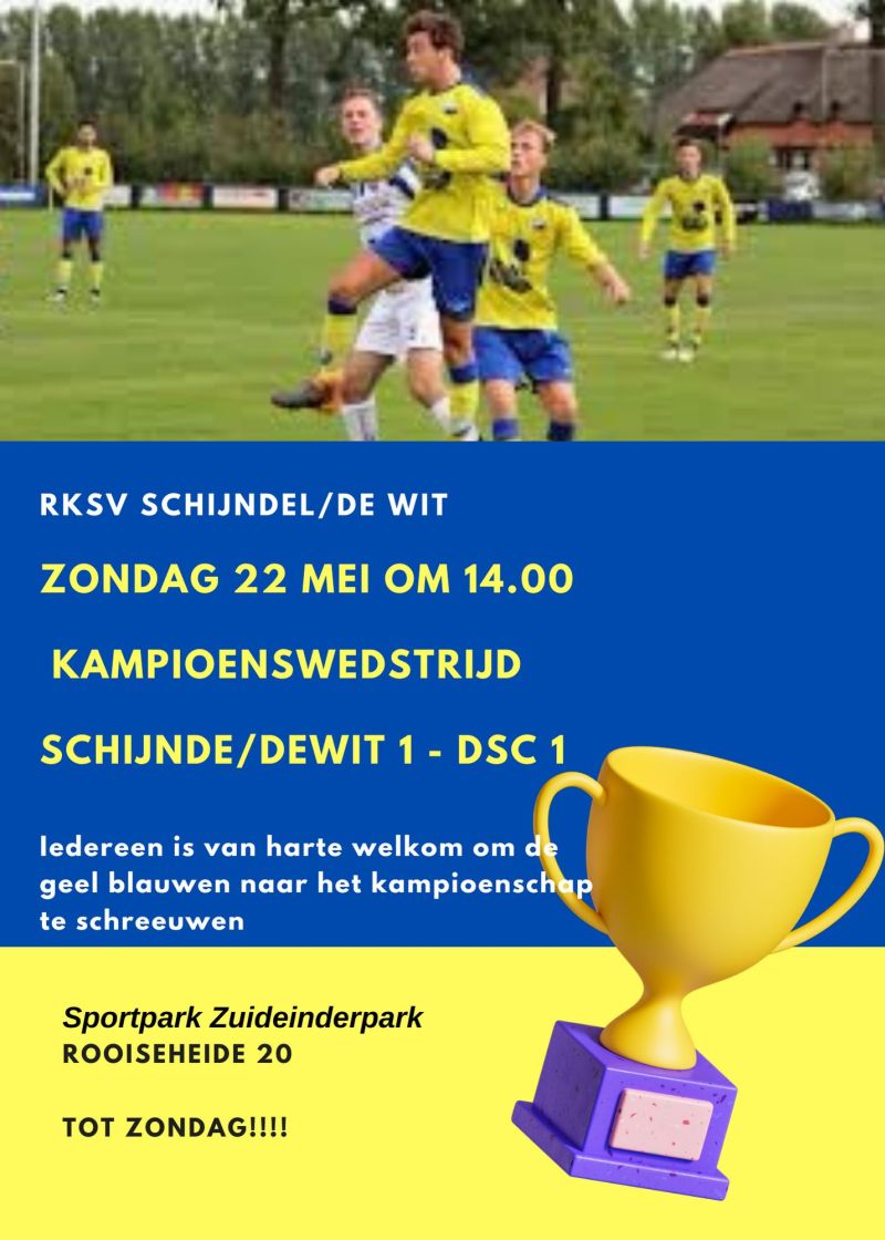 In de wetenschap dat de directe concurrenten geen fouten maakten leidt Schijndel/DE WIT de stand in de 3e klasse C nog steeds met zeven punten voorsprong . Met nog drie wedstrijden te gaan kan zondag a.s. met een overwinning tegen DSC uit Kerkdriel in de thuiswedstrijd de kampioensschaal in ontvangst nemen. Met het vertoonde spel van deze zondag kan ook deze wedstrijd met vertrouwen tegemoet worden getreden.