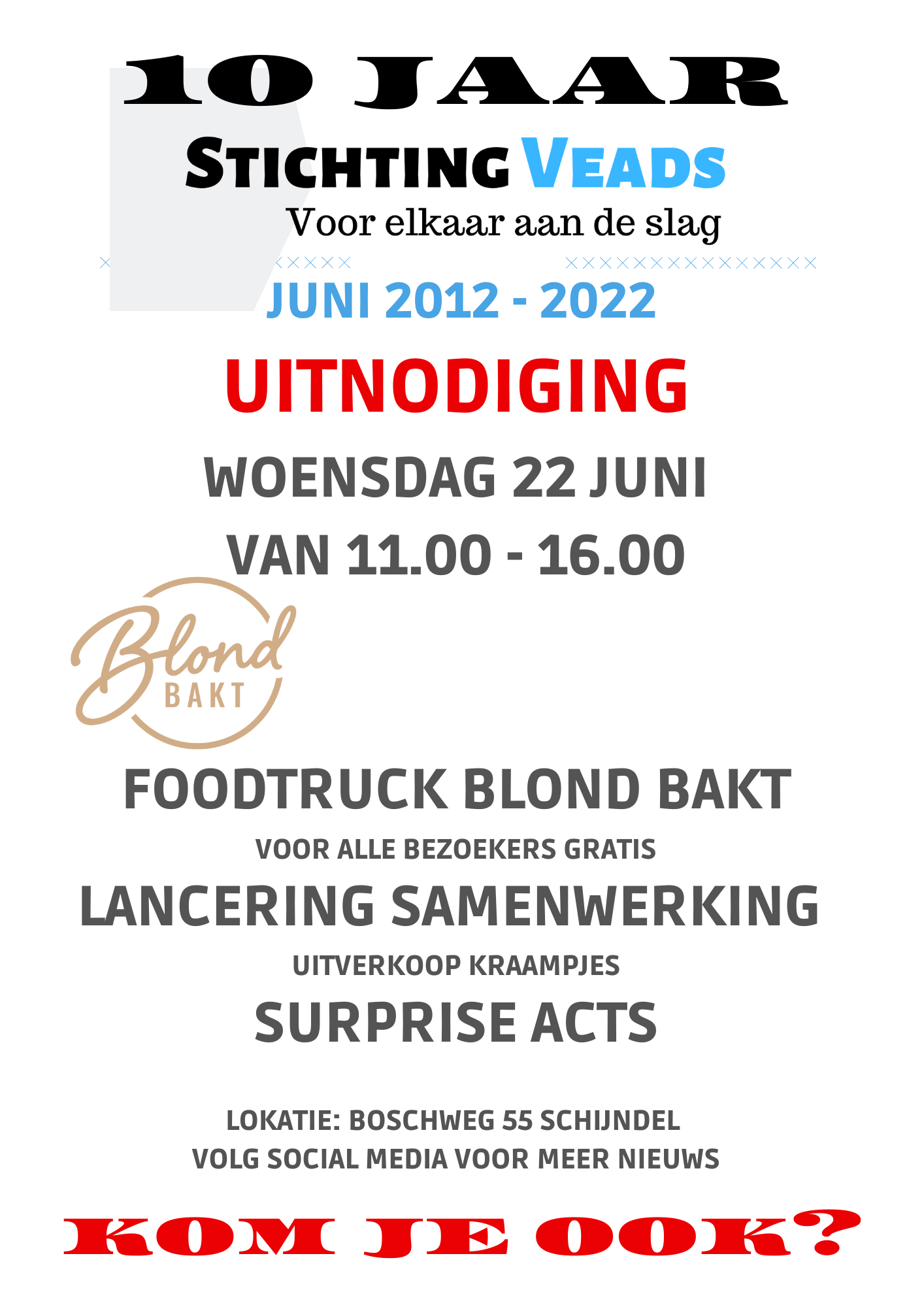 Schijndel - Stichting-Kringloop Veads (Voor elkaar aan de slag) bestaat in juni 2022 tien jaar. Dit wordt gevierd op woensdag 22 juni van 11.00 uur tot 16.00 uur aan de Boschweg 55 Schijndel in Kringloop Veads. Alle bezoekers worden getrakteerd op gratis snacks en er zullen buiten kraampjes staan met spullen die u gratis of voor weinig mee kunt nemen. Wees er op tijd bij: OP=OP.