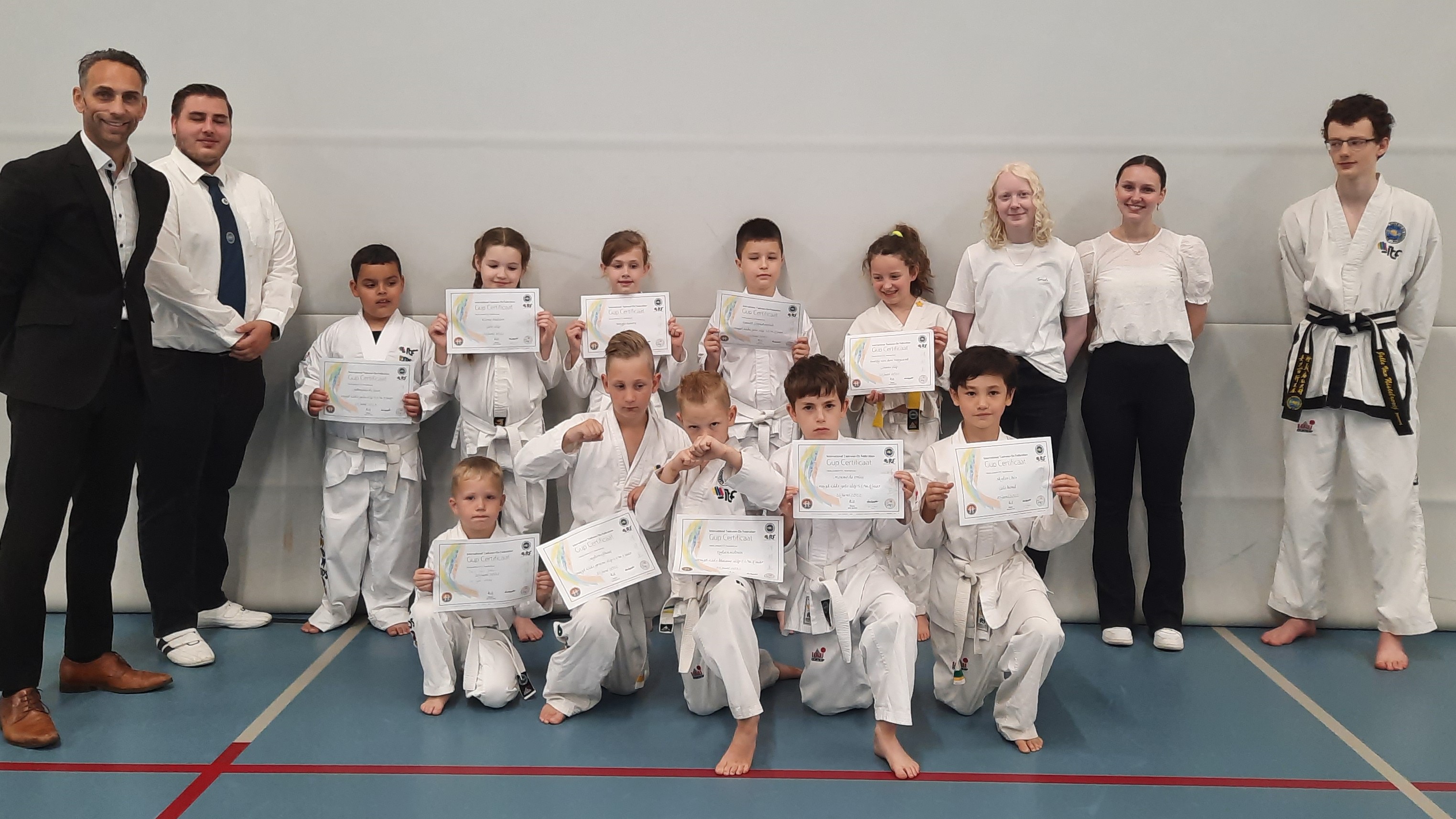 De examen commissie was blij verrast dat de voorbereiding ten goede was gekomen voor dit examen met flink wat publiek. Menno de Vries Jeugd Kids gele slip 5 t/m 8 jaar. Jahraino de Laat Jeugd Kids gele slip 5 t/m 8 jaar. Dawid Gryndzieluk Jeugd Kids gele slip 5 t/m 8 jaar. Ezra van Uden Jeugd Kids gele slip 5 t/m 8 jaar. Jaylen Eijhout Jeugd Kids groene slip 5 t/m 8 jaar. Dylan Wolven Jeugd Kids blauwe slip 5 t/m 8 jaar. Elena Hulsen Gele slip. Bregje Bevers Gele slip. Skyler Chin Gele band. Audry van den Boogaard Groene slip. Jasmijn de Vries Blauwe slip. Thomas de Vries Blauwe slip. Julian Valks Rode slip. Owen Verhagen Rode slip. Elena Hambartsumian Rode slip. Alexander van Maris Rode slip. Rebecca Broeren Rode slip