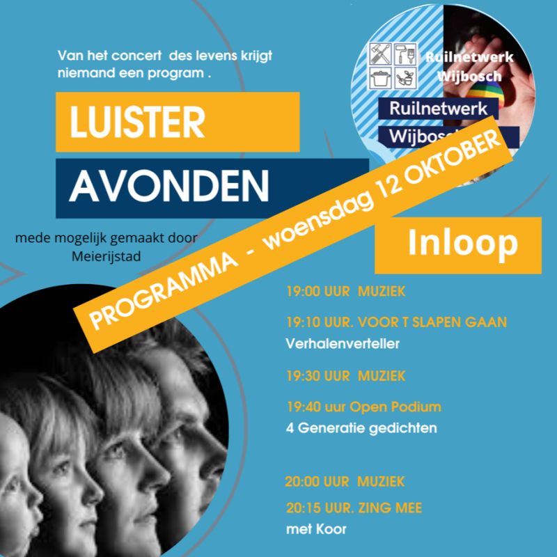 Schijndel - Samen met de partners Vitaal Wijzer, De Regenboog, Kinderdagverblijf, Laverhof en mede mogelijk gemaakt door de gemeente Meierijstad, heeft het Promo team van Ruilnetwerk Wijbosch het initiatief genomen voor deze nieuwe activiteit. Gezien het grote succes van de eerste Luisteravond is de volgende op woensdag 12 oktober. Luisteravond is een inloopavond voor iedereen waarbij luisteren voorop staat. Luisteren naar muziek, een gedicht, een liedje, een informatief gesprek, een filmpje of open podium.