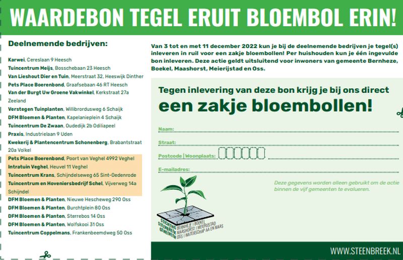 Meierijstad - Wilt u meehelpen om Meierijstad groener te maken? Dan heeft u nu de kans om een eerste stap te zetten. Lever tussen 3 t/m 11 december 2022 een stoeptegel in en u krijgt een gratis zakje bloembollen (ter waarde van € 6,-).