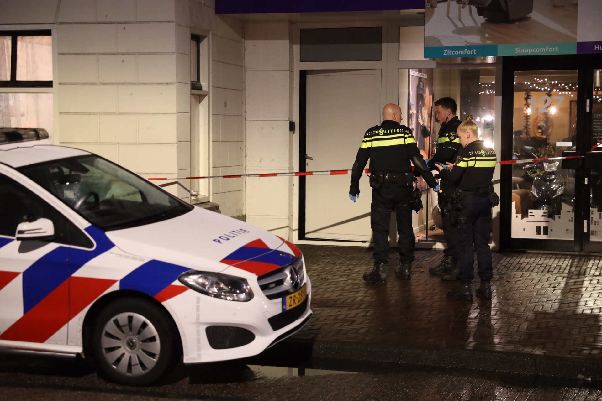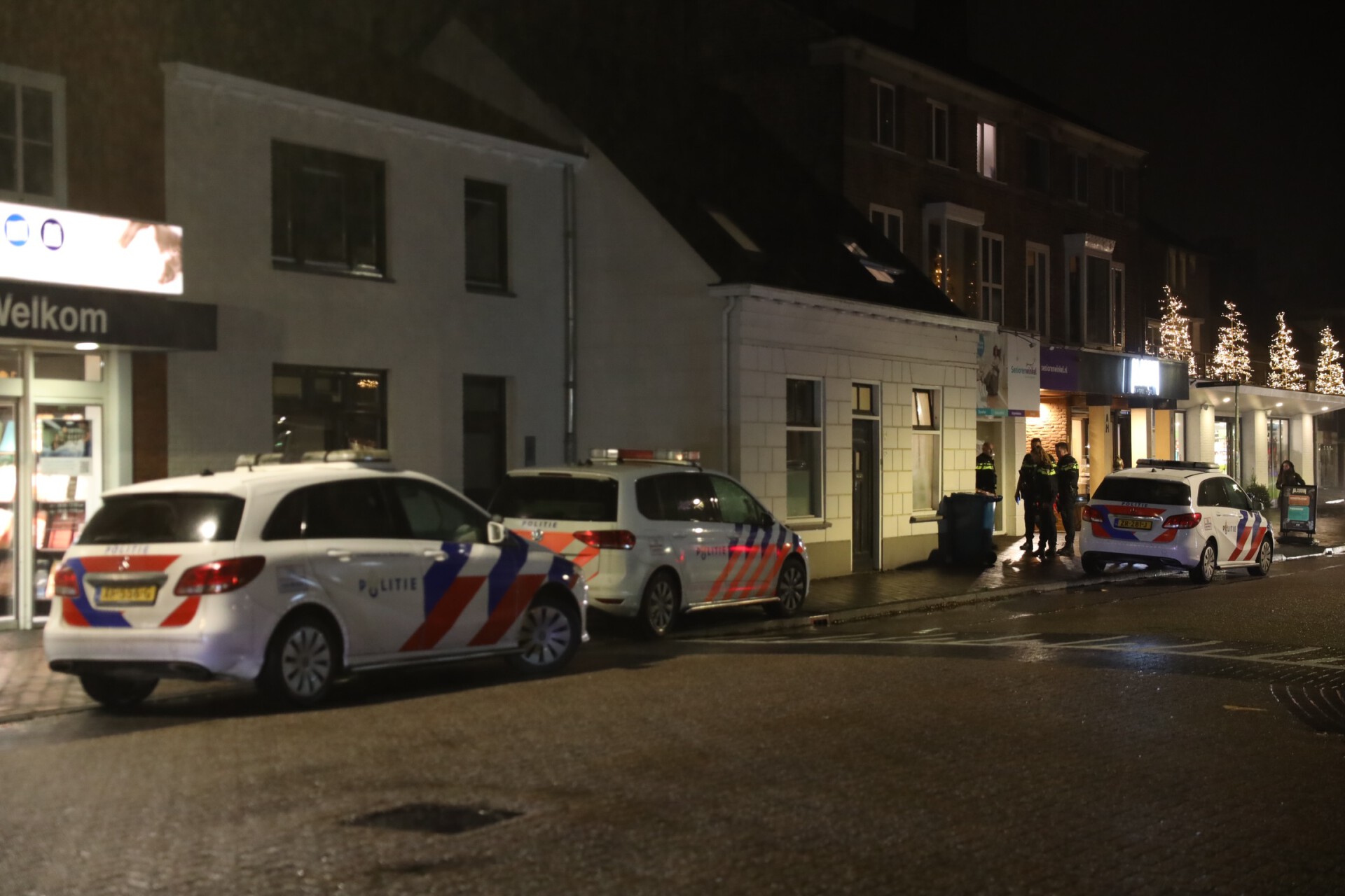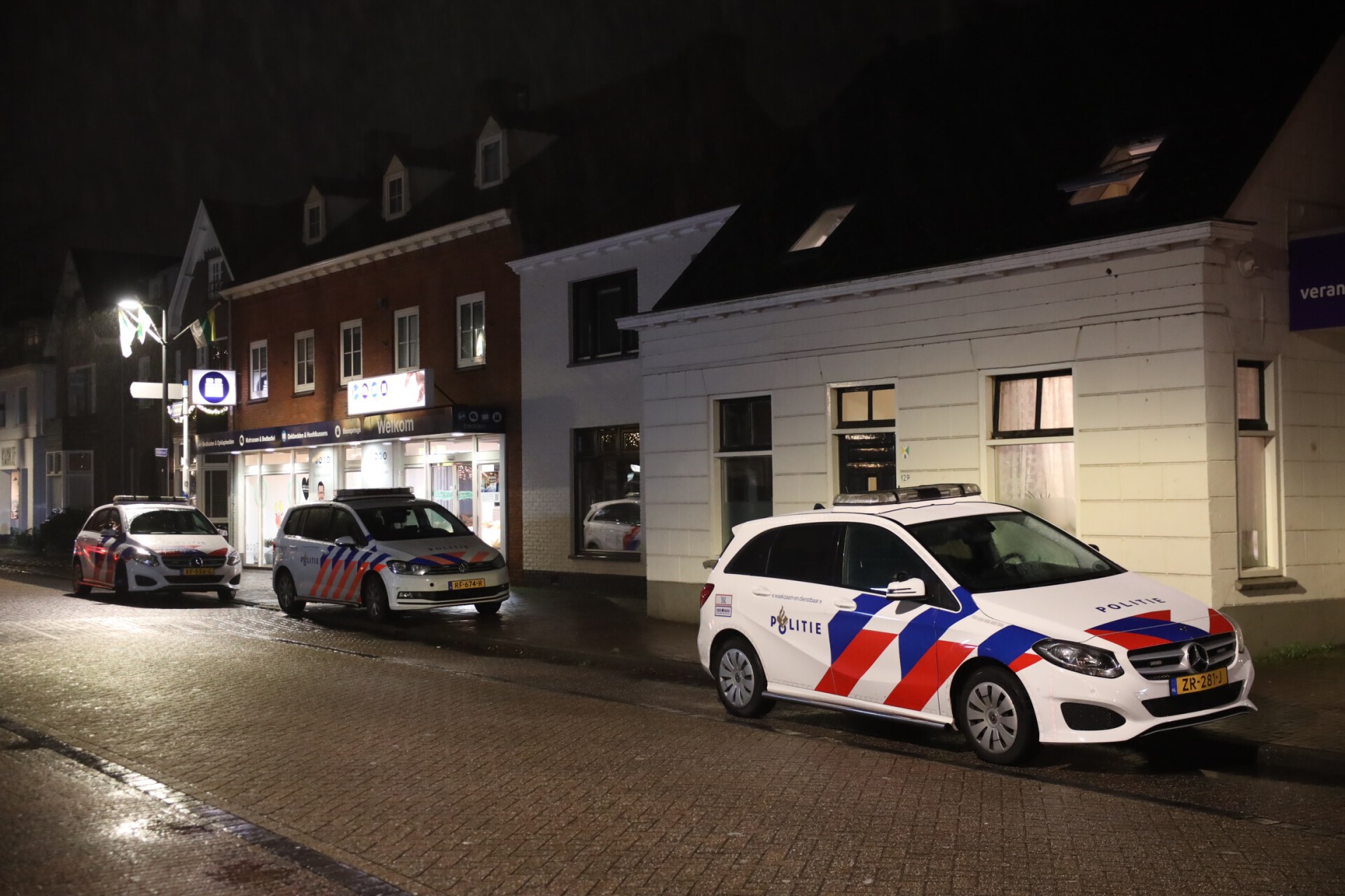 De politie gaat onderzoeken wat er exact is gebeurd. Er staan veel politievoertuigen geparkeerd op de stoep tussen de Beddenwinkel en de Plus. Voorbijgangers kijken nauwelijks op van de politie-inzet.
