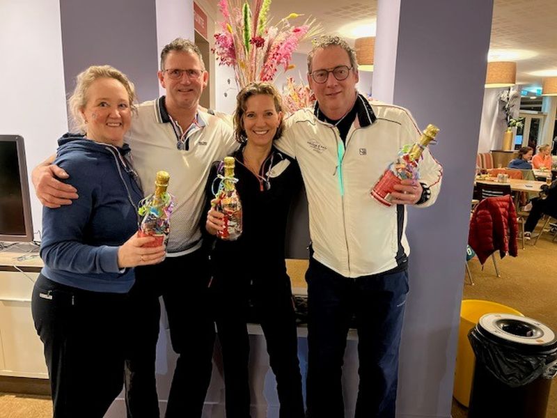 Meer deelnemers en meer leden Dit jaar zouden er 22 jeugdleden en 24 senioren meedoen aan het toernooi. Helaas werkten het weer niet mee. Er werd te veel regen en wind voorspeld om het voor de jeugd een leuk en veilig toernooi te laten zijn. Maar later in de avond ging de wind liggen en werd het droog waardoor de senioren leden wel van start konden gaan. Er waren 6 banen geheel in blacklight aangekleed. Uiteraard waren ook de deelnemers in blacklight gekleed. In 2 poules streden de deelnemers om de eer. Winnaars bij de senioren waren Theo Heerkens / Joan van Loon en Marie-Anne van Ree / Marian van Dijke.
