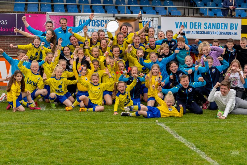 Een dag eerder, op zaterdag 6 mei, hadden de meiden van MO13-1 al het goede voorbeeld gegeven. Door thuis met 3-1 te winnen van Blauw-Geel zijn zij met nog 3 speelrondes te gaan niet meer te achterhalen. Ontzettend knap voor een team dat dit seizoen pas voor het eerst samen speelt. Voor beide ploegen is dit een felicitatie waard. Foto's Lieke van Grinsven van Aarle