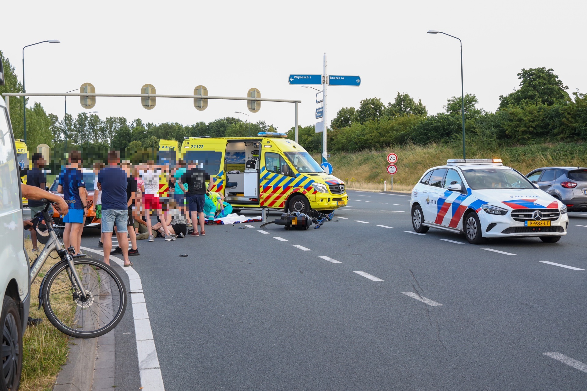 De andere opzittende, een meisje van 15, raakte zwaargewond en werd na ruim een uur behandeling ter plaatse naar het ziekenhuis gebracht. Enkele omstanders zouden hebben gezegd dat het mogelijk om een straatrace zou gaan, het groepje brommerrijders zou daarmee bekend zijn aldus de omstanders tegen Omroep Brabant. De politie kon hier op dit moment nog geen uitspraken over doen. De personenauto raakte door het ongeval ook flink beschadigd, de inzittende daarvan kwamen met de schrik vrij. info en foto's: Persburo Sander van Gils/Remco Rooijakkers