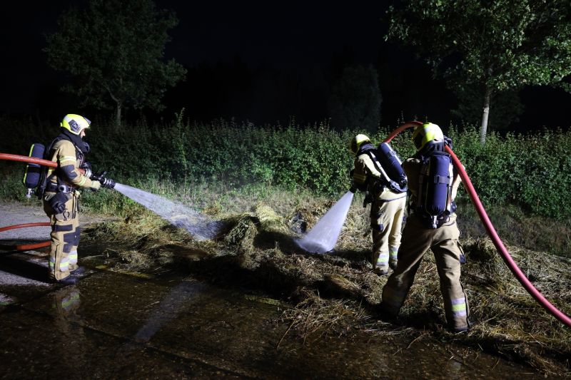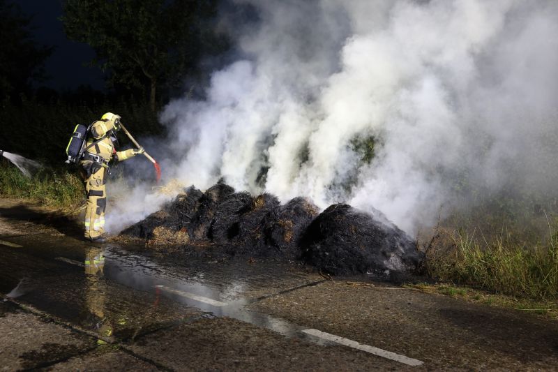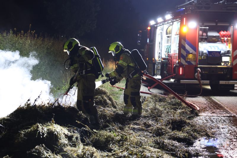 Naast een tankautospuit kwam ook een waterwagen ter plaatse met extra bluswater. Het uit elkaar getrokken hooi werd nog eens goed nat gemaakt om er zeker van te zijn dat het uit was. De doorgang op de parallelweg was tijdens de inzet van de brandweer gestremd. Tekst en foto's Persburo Sander van Gils.
