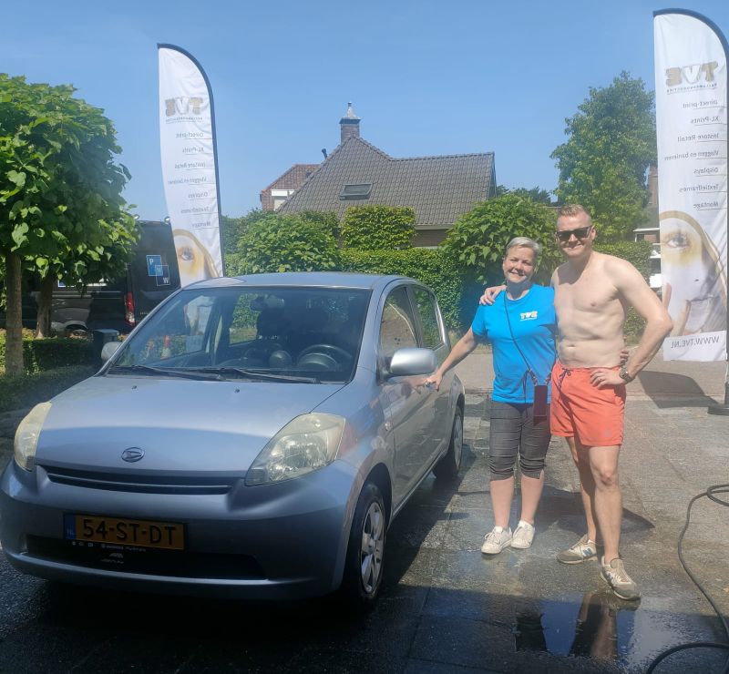 Zaterdag 8 juli hadden ze weer een leuke actie op de agenda staan, de hele dag auto's gewassen in Eerde, maar liefst €615,- hier mee opgehaald en deze opbrengst gaat geheel naar Kika. Daarnaast heeft zijn buurvrouw Monique Riem koekjes gebakken en deze tijdens De Witte Tornado Carwash Show verkocht en hier mee ook nog eens €50,- voor Kika mee opgehaald.