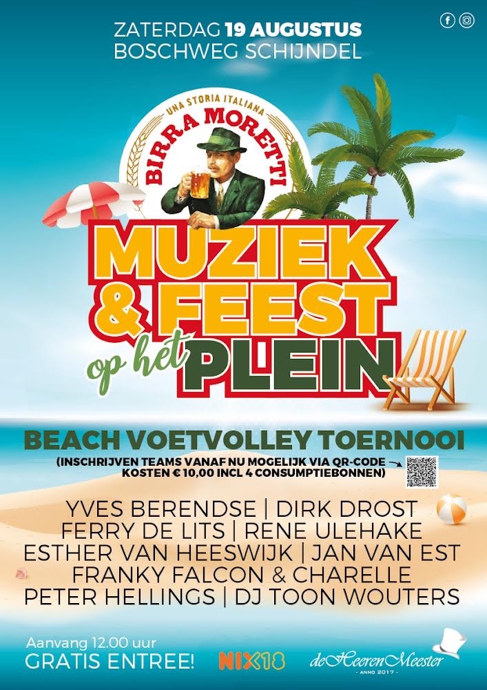 Schijndel - Zaterdag 19 augustus wordt op het plein op de Boschweg een Beach Voetvolley toernooi georganiseerd. Inschrijven kan via de QR code op de poster (zie hieronder) of aan de bar bij HeerenMeester.