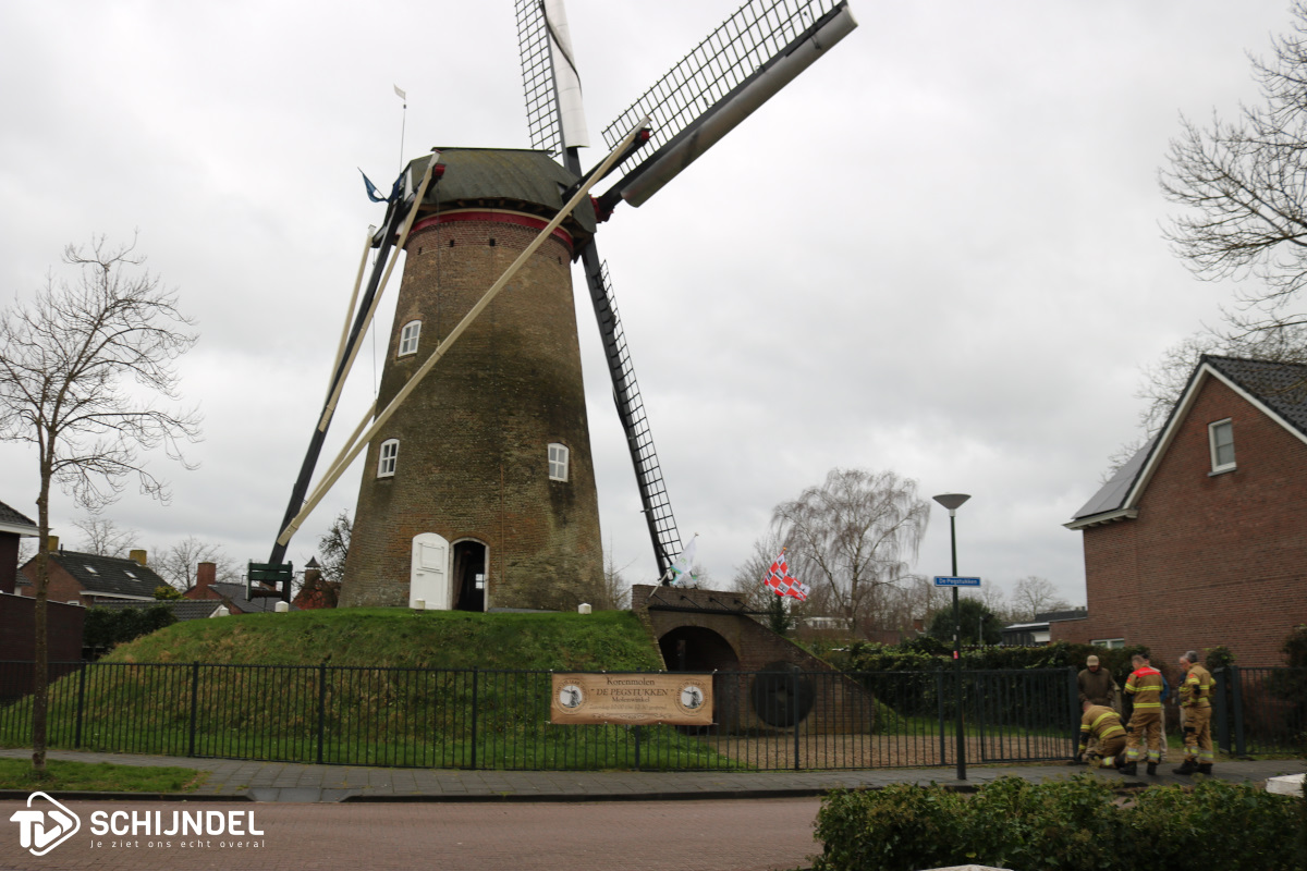Schijndel - De brandweer van Veghel werd zaterdagochtend rond tien uur opgeroepen voor 'Dienstverlening' aan De Pegstukken. Bij de molen bleek een stuk van de dakbedekking losgewaaid te zijn. Beheerders ontdekten vanochtend de schade bij het openen van de molen. De hoogwerker van Veghel kwam ter plaatsen. De brandweerwagen bij de molen trok aardig wat bekijks van buurtbewoners.