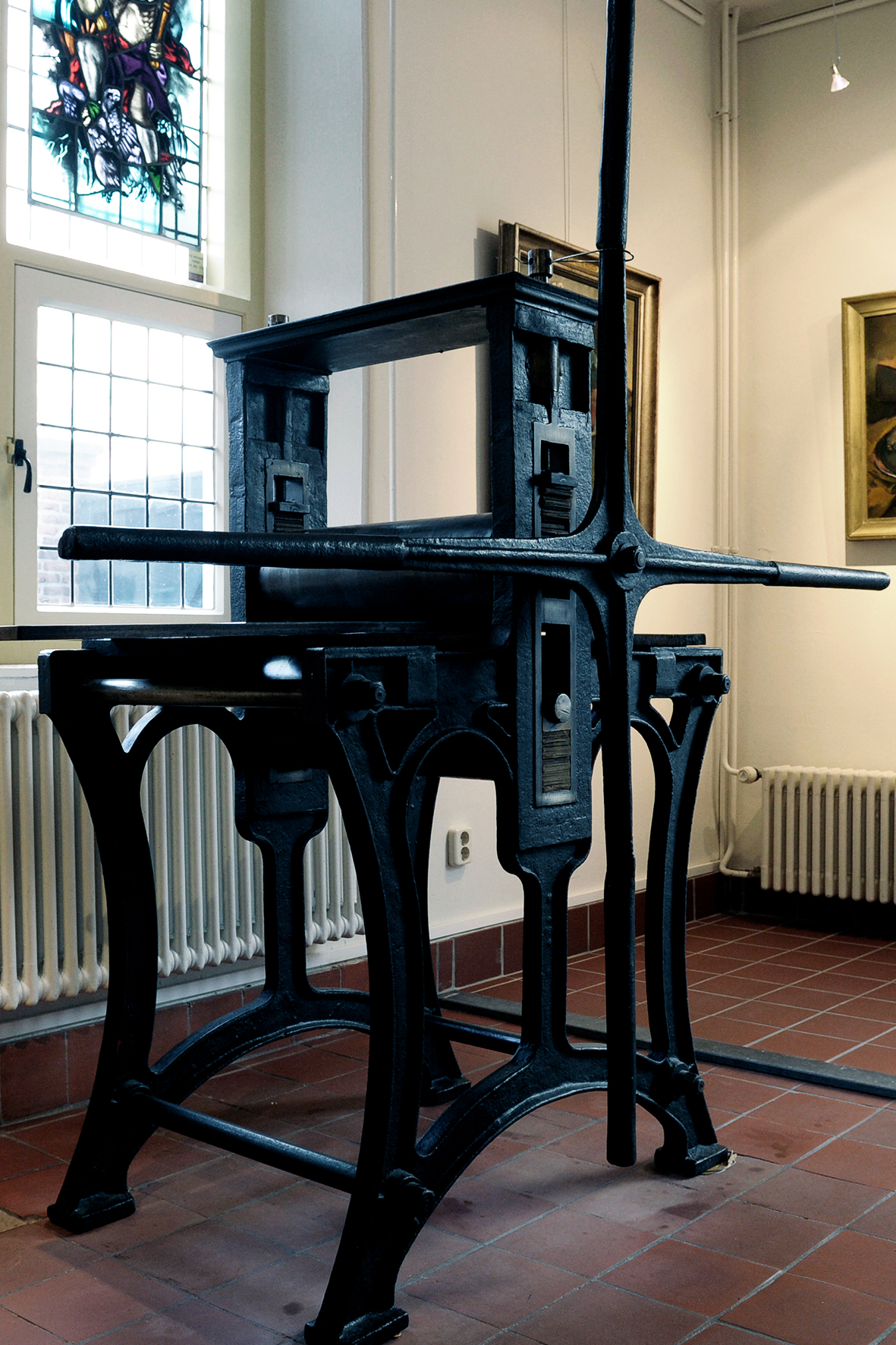 Op zaterdagmiddag 9 maart zal Rein van Uden, zelf kunstenaar, de monumentale etspers weer in gebruik nemen. Hij gaat demonstreren hoe het proces van etsen in zijn werk gaat.