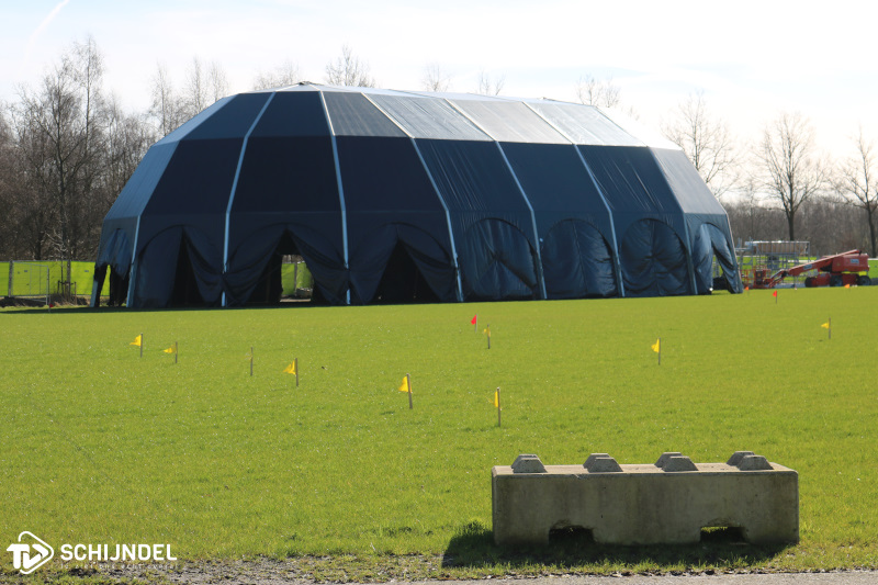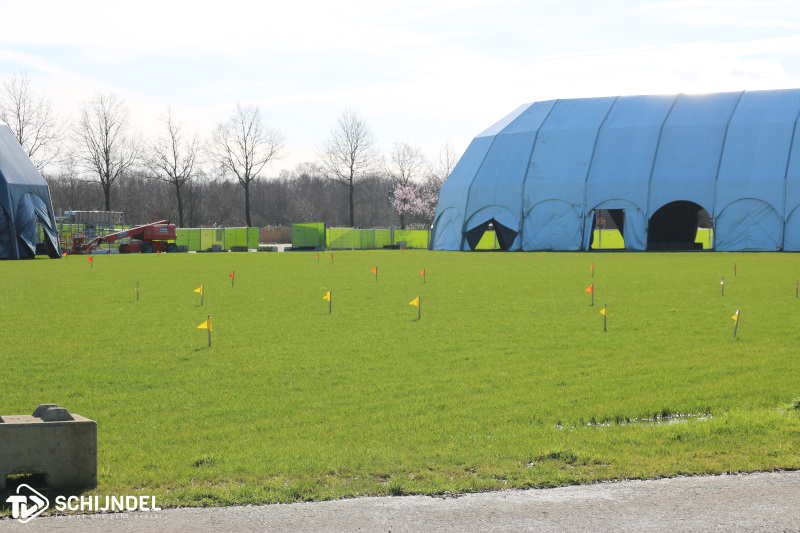 Tussen de groene hekken door is te zien hoe hard er word gewerkt op het terrein: bakken vol steigermateriaal worden aangeleverd. Boven de hekken torenen inmiddels vijf grotere tenten uit, sommige inclusief de Paaspop vlag. Veel voorbijgangers stoppen even voor een foto. "Als we dit zonnige weer over vier weken ook hebben, kan het voor ons niet meer stuk!' laat een wandelaar weten.