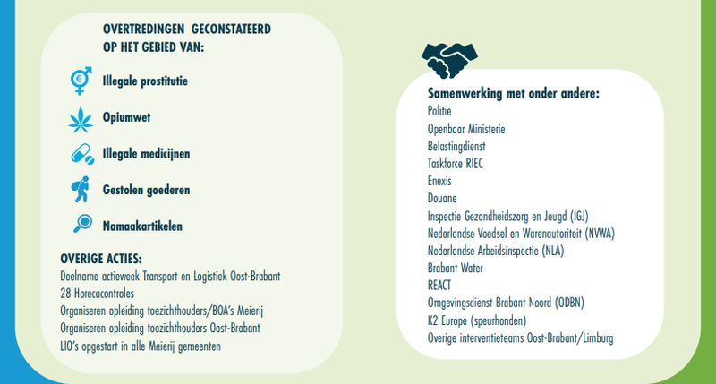 Meierijstad In Meierijstad werden diverse henneplocaties aangetroffen. Ook werden nepartikelen en illegale sigaretten en shag in beslag genomen. Handel in dit soort artikelen zorgt voor oneerlijke concurrentie. Daarnaast wordt over de winst op deze artikelen geen belasting afgedragen. Sint-Michielsgestel De gemeente Sint-Michielsgestel is de gemeente waar de meeste controles plaatsvonden. Dat waren er maar liefst 102. Dit komt omdat er meerdere locaties met opslagboxen zijn bezocht. In die boxen werden onder meer gestolen koelgasflessen, een gestolen auto en 325 kilo BMK aangetroffen. BMK is een grondstof die gebruikt wordt voor het vervaardigen van harddrugs. Ook werden in een loods 2000 knaagdieren aangetroffen die daar gehuisvest waren onder slechte omstandigheden. Vught In Vught werden relatief veel gevallen van illegale prostitutie geconstateerd. Het BIM verklaart dit uit het feit dat Vught vanuit ’s-Hertogenbosch makkelijk bereikbaar is. In Vught werden ook hennep en harddrugs aangetroffen. Boxtel In Boxtel werden door het BIM een henneplocatie en 500 kilo designerdrugs aangetroffen. Omdat designerdrugs nog niet verboden zijn, kon daar strafrechtelijk niet tegen op getreden worden. Wel bleek dat de drugs op grond van milieuwetgeving niet op de juiste manier werd opgeslagen. Omdat dit gevaar opleverde voor de omgeving van de opslaglocatie, is de partij afgevoerd door de omgevingsdienst. Op dit moment is er een wetsvoorstel door de Tweede Kamer aangenomen om ook deze designerdrugs strafbaar te stellen onder de Opiumwet. Heusden Bij controles in Heusden werden meerdere gestolen elektrische fietsen gevonden. Ook werden er wapens gevonden. Zowel de fietsen als de wapens zijn in beslag genomen. Het BIM treft vaker illegale medicijnen aan in winkels, ook in Heusden was dat het geval. Omdat deze medicijnen niet gecontroleerd zijn, worden ze altijd in beslag genomen ter bescherming van de gezondheid van klanten van de winkels.