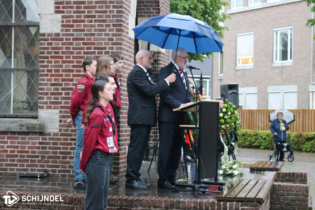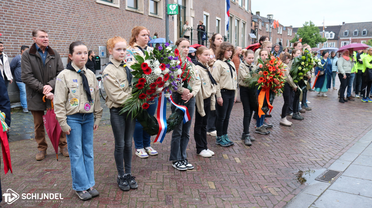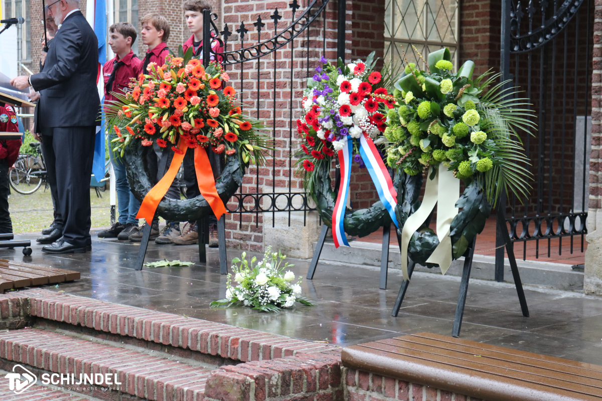 De kranslegging werd begeleid door scouting Schijndel. Hierbij bracht de Drumfanfare muziek ten gehore en bracht het Gilde een vaandelgroet. Maud las haar gedicht voor, wethouder Goijaarts hield de gemeentelijke toespraak. Na het taptoe signaal was er om acht uur 2 minuten een regenachtige stilte te horen. Dit werd gevolgd door het Wilhelmus.