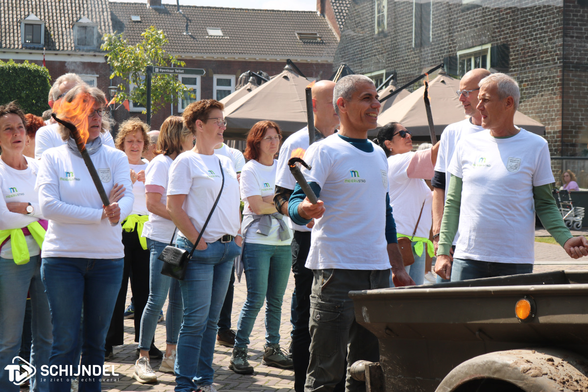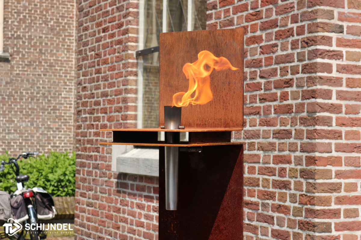 Schijndel - Het Bevrijdingsvuur uit Wageningen kwam vandaag aan in Schijndel. Loopgroep Wijbosch bracht het vuur, voorafgegaan door een grote groene Jeep, rond twee uur 's middags naar de Gedachteniskapel op de Markt. Enkele wandelaars van de groep hadden een grote brandende fakkel bij zich. Twee wandelaars mochten de vlam bij de kapel ontsteken.