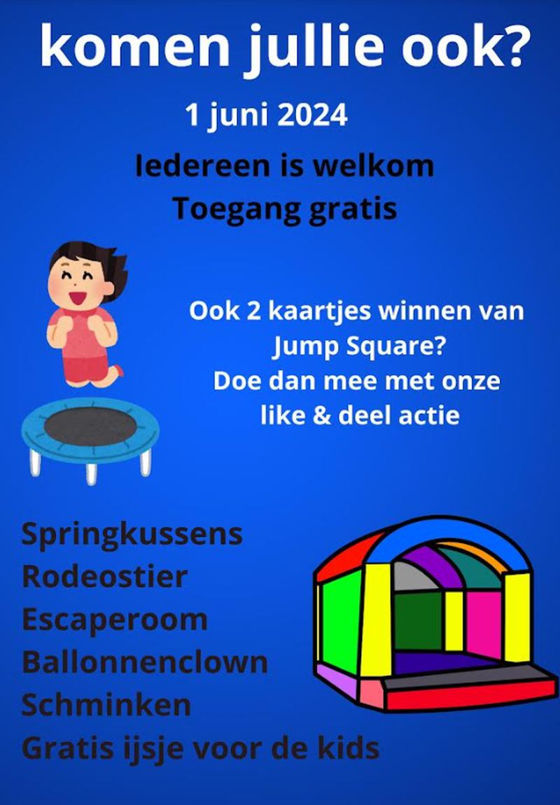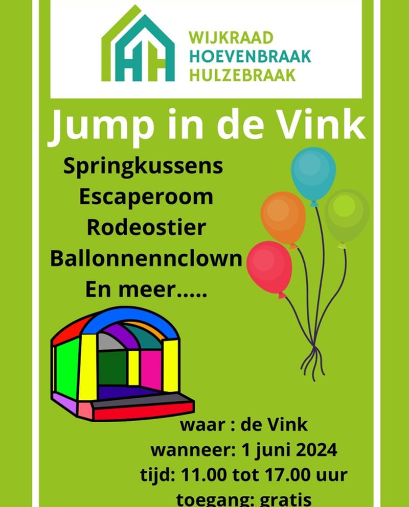 Zaterdag 1 juni staat vol in teken van jumpen. In de Vink zullen er meerdere springkussens en een rodeostier staan. Buiten zal er voor oudere kinderen een grote escaperoom staan. Hiervoor kan men zich op 1 juni bij de vrijwilligers inschrijven. Ook loopt er die dag een ballonnenclown rond. Maar je kan je ook laten schminken. In de Vink zal een DJ muziek draaien waar men ook kan dansen.
