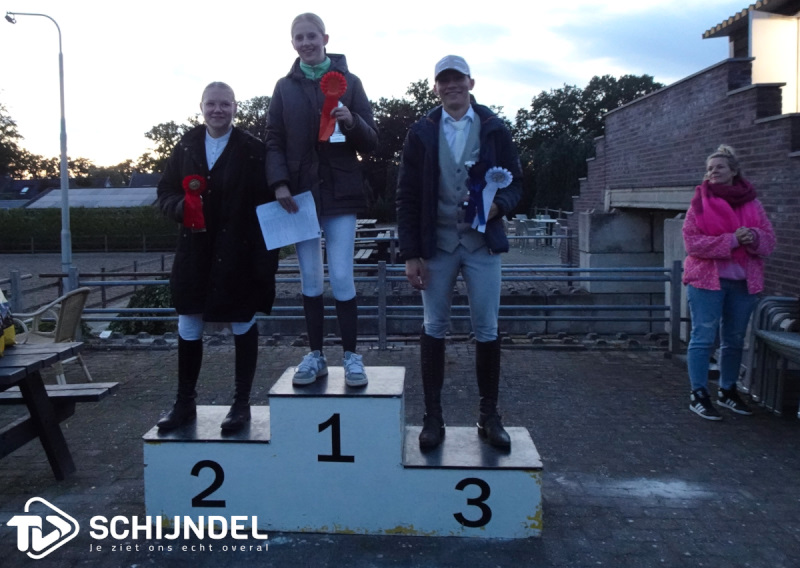 In de ochtend startten de dressuurruiters in verschillende klassen. De jonge talentjes, die weinig wedstrijden gereden hebben, reden hun B-proef. De uitslag van . Klasse B-12 jaar en ouder: 1. Lois Meulders met Diamond, 2. Joy vd Oetelaar met Gouverneur, 3. Janiz de Groot met Rocko Klasse B- 12 jaar en ouder: 1. Naomie van Uden ,et JdeB, 2. Anouk vd Spank met Gouverneur Klasse L1/L2: 1. Floor van Lent met Anjo, 2. Sanne Meijs met Surprise the Peru, 3. Evi vd Heuvel met Tonka Klasse M1: 1. Indy Kastelijn met Santiogo Klasse Z1: 1. Jolanda Schouten met Nelida, 2. Audrey Claesens met Red Rose