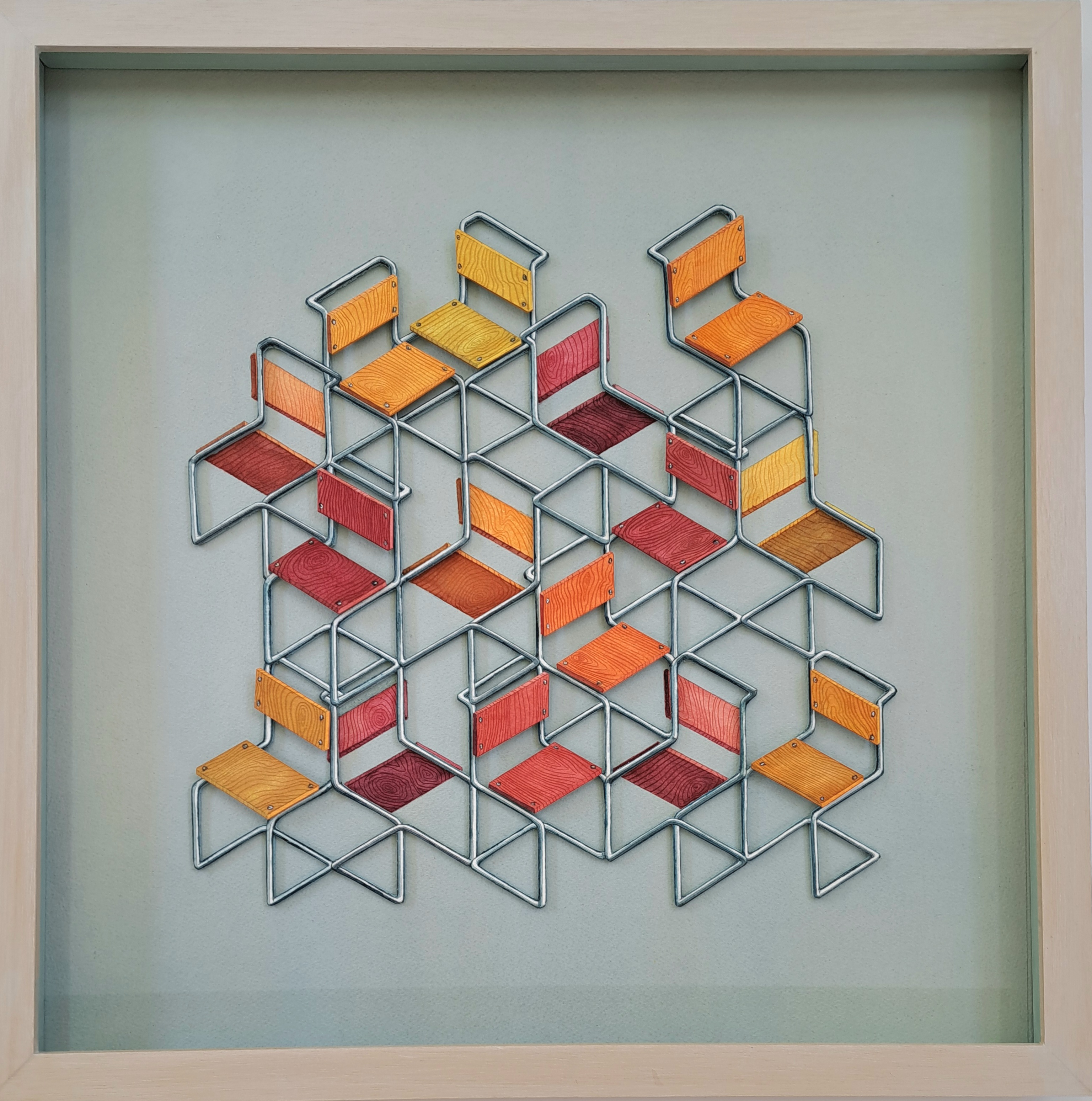 Een vlootschouw van stoelen, klein en groot, kleur en zwart-wit. Dit hele beperkte vertrekpunt: een stoel, blijkt een enorme rijkdom op te leveren. Want op allerlei mogelijke manieren raakt, reageert en reflecteert die wereld op de onze én verrijkt deze daarmee. Stoel In 1989, begonnen met één stoel en al snel gevolgd door nog een, is het uitgangspunt gaandeweg ook gekanteld, omdat een stoel ook een woord of begrip kan verbeelden. Kuypers blijkt vrijwel alles te relateren aan of te combineren met een stoel. Zaken uit zijn verleden en leven maar ook uit de hedendaagse cultuur.