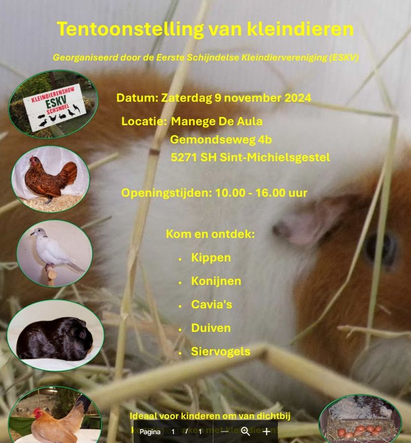Dit jaar zijn ook de Schijndelaar (de kip die groene eieren legt) en het Meierij’s Hoen te bewonderen. Twee kippenrassen die in Schijndel en Meierijstad zijn ontstaan door inzet van enkele leden van E.S.K.V. Uitnodiging E.S.K.V. nodigt u uit om deze dierententoonstelling te komen bezoeken. Datum: Zaterdag 9 november 2024 Tijd: van 10.00 tot 16.00 uur Locatie: Manege De Aula, Gemondseweg 4b, 5271 SH Sint-Michielsgestel GRATIS ENTREE Kom en ontdek: Kippen Konijnen Cavia's Duiven Siervogels U bent van harte welkom. Tot ziens op 9 november!