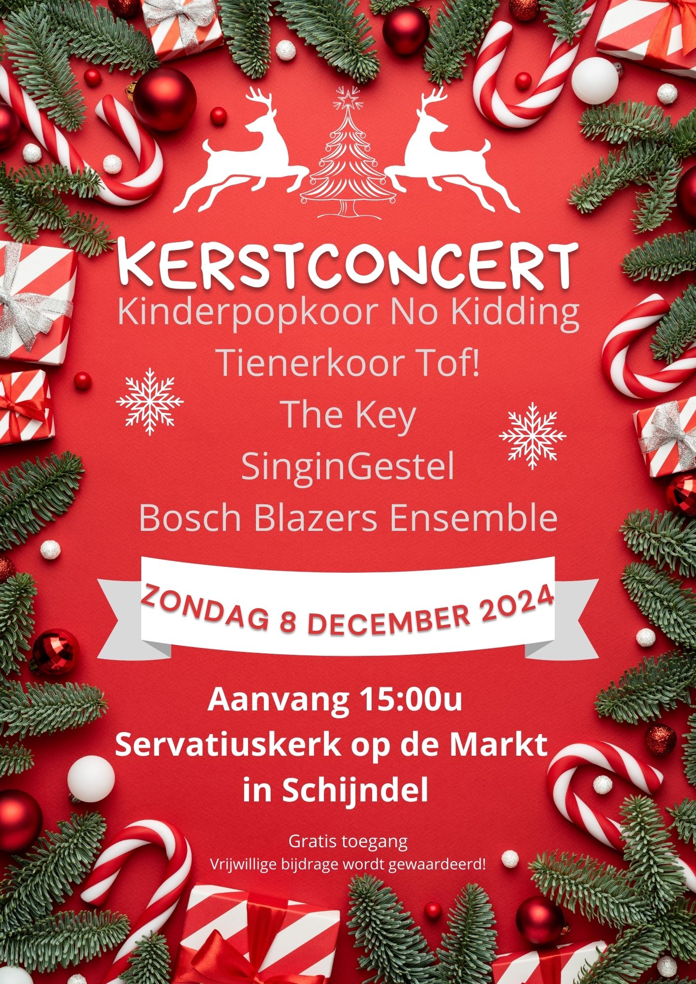 Tijdens het concert laten de koren Kinderpopkoor No Kidding, Tienerkoor Tof!, Popkoor The Key, SinginGestel en het Bosch Blazers Ensemble hun mooiste klanken horen. Op het programma staan niet alleen traditionele kerstliederen, maar ook nummers die draaien om thema’s als samen, hoop en vrede. Dit kerstconcert is de perfecte gelegenheid om samen met familie en vrienden in de kerstsfeer te komen. De warme ambiance van de Servatiuskerk en de prachtige muziek maken dit een onvergetelijke middag.