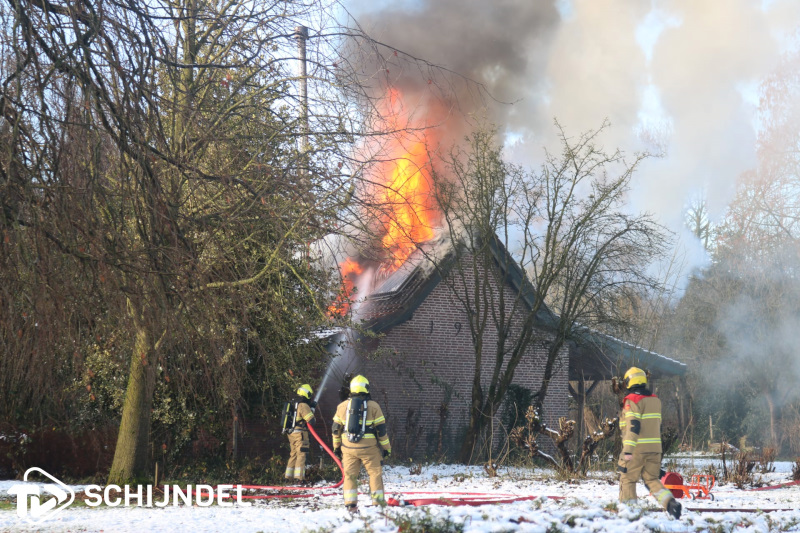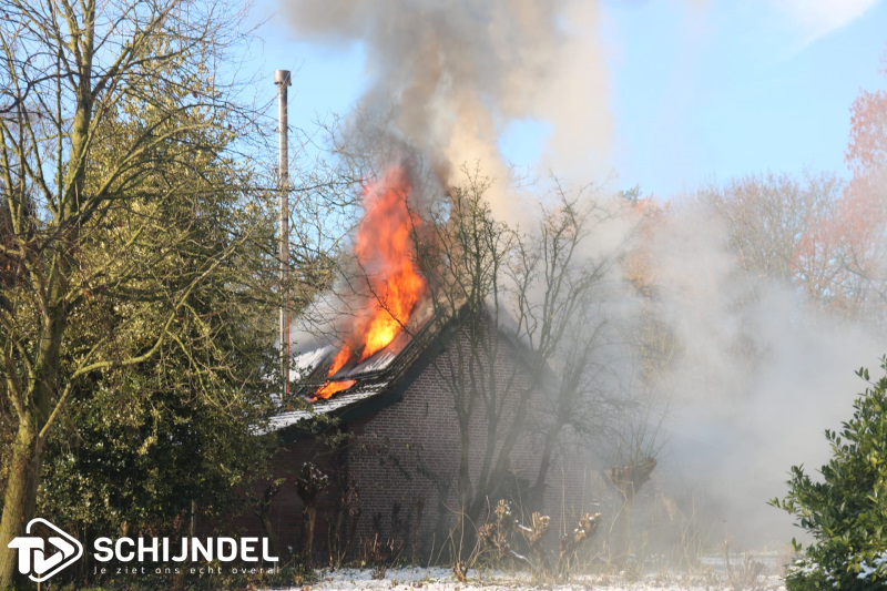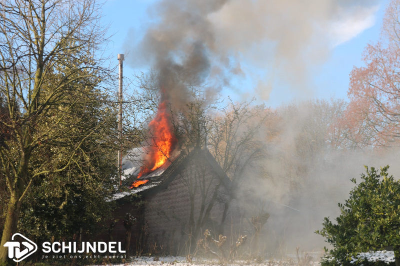 Schijndel - Aan de Poelkensdijk in Schijndel brak donderdagmiddag rond 14.15 uur een uitslaande brand uit in een bijgebouw. De vlammen sloegen uit het dak. Er was veel rookontwikkeling, de rook trok over de weilanden weg.