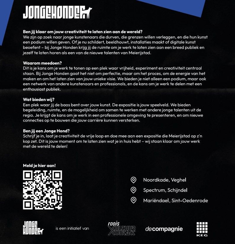 Zijn jouw creaties straks ook te zien is in het Spectrum, de Noordkade of in Mariendael ? Ken jij een talentvolle kunstmaker die een unieke kans verdient ? Trek dan die Jonge Hond over de streep. Aanmelden kan tot 1 februari via de websites van de Compagnie, de KEG en RKK https://www.decompagnie.art/jonge-honden.html.