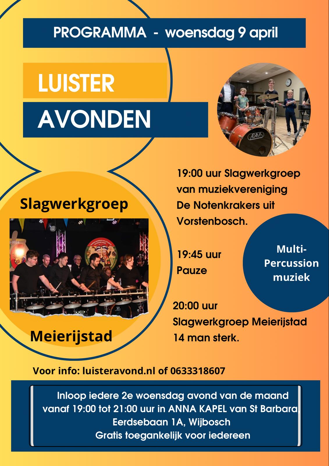 Wijbosch - Opnieuw een ander dan andersavond omdat deze keer twee slagwerkgroepen de Luisteravond volledig gaan vullen met hun instrumenten!
