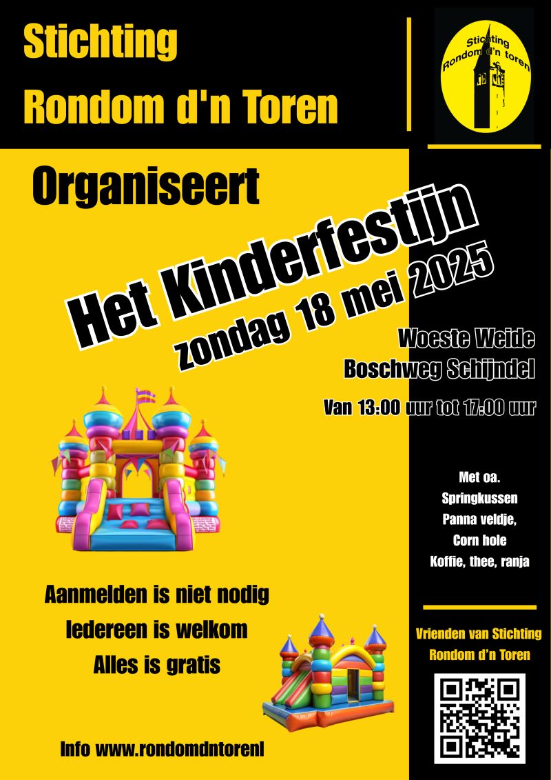 Schijndel - Op zondag 18 mei pakt Stichting Rondom d’n Toren weer groots uit met een kinderfestijn op de woeste weide in Schijndel. Vanaf 13.00 uur tot 17.00 uur kun je springen, klauteren voetballen en zelfs laser gamen.