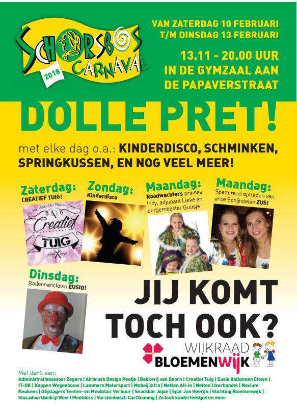 Schorsbos - Dit jaar organiseert Wijkraad Bloemenwijk Schijndel het Kindercarnaval in de Bloemenwijk. Zaterdag 10 februari tot en met dinsdag 13 februari van 13.11 tot 20.00 uur aan de Papaverstraat. Op het programma staan voor zaterdag Creatief Tuig, voor zondag een kinderdisco, op maandag de Roadwachters (met de jeugdprinses, adjudant en burgemeester) met eveneens op maandag een optreden van Zus en op dinsdag ballonnenclown Eusio.